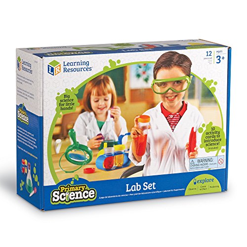12-piece set includes: beaker, magnifying glass, funnel, eyedropper, flask, tweezers, goggles, 1 large 6" test tube (with lid and stand), 2 small test tubes (with lids and stands), plus 10 activity cards