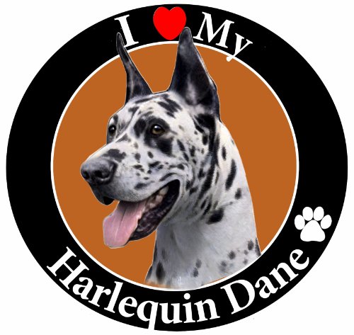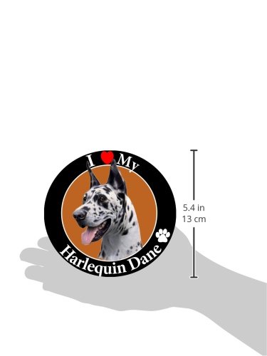 "I Love My Harlequin Dane" Car Magnet With Realistic Looking Harlequin Dane Photograph In The Center Covered In UV Gloss For Weather and Fading Protection Circle Shaped Magnet Measures 5.25 Inches Diameter