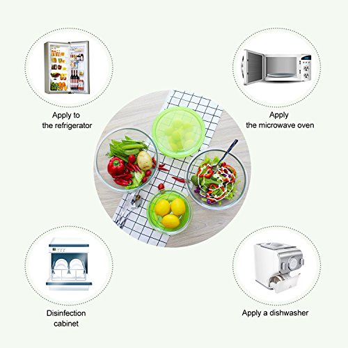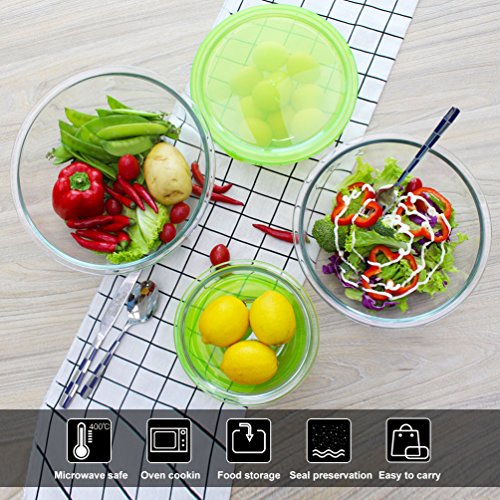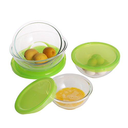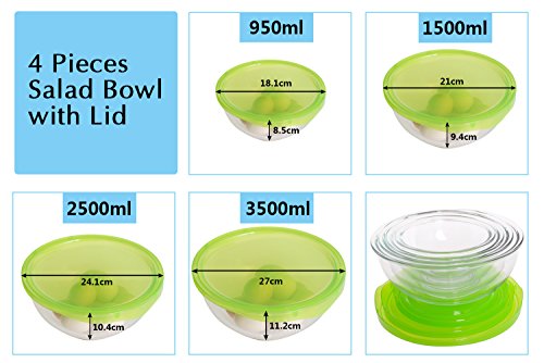 SET INCLUDES:Pack of 4 Glass Mixing Bowls,Each with Green lid(FDA approved).Size is 32.2oz(4.03cup), 50.85oz(6.36cup), 84.75oz(10.59cup) and 118.64oz(14.83cup).