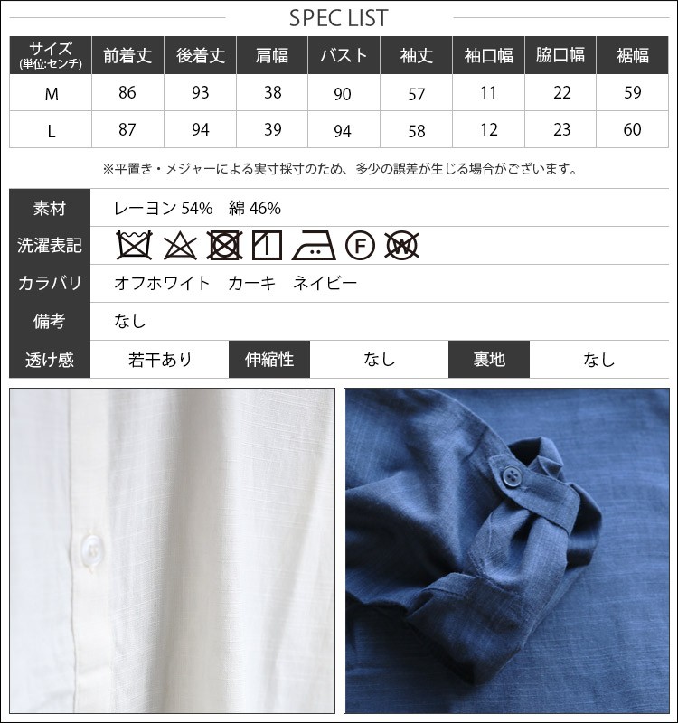L:前着丈 87cm 後着丈 94cm 肩幅 39cm バスト 94cm 袖丈 58cm 袖口幅 12cm 脇口幅 23cm 裾幅 60cm