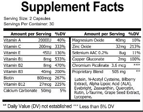 HEALTHY, NATURAL FORMULA - Formulated in an FDA registered facility, our ingredients are premium and all natural, including Vitamin A, C, E, B1, B2, B3, Biotin, Vitamin B12, Calcium Carbonate, Magnesium Oxide, Zinc Oxide, Selenium AAC 0.2%, Copper Gluconate, Chromium Picolinate, Proprietary Blend: Lutein, N-Acetyl Cysteine, Blueberry Extract, Alpha Lipoic Acid (ALA), Eyebright, Zeaxathin, Quercetin, Rutin, L-Taurine, Grape Seed Extract, Lycopene