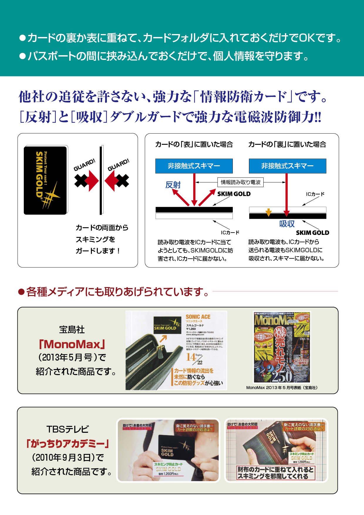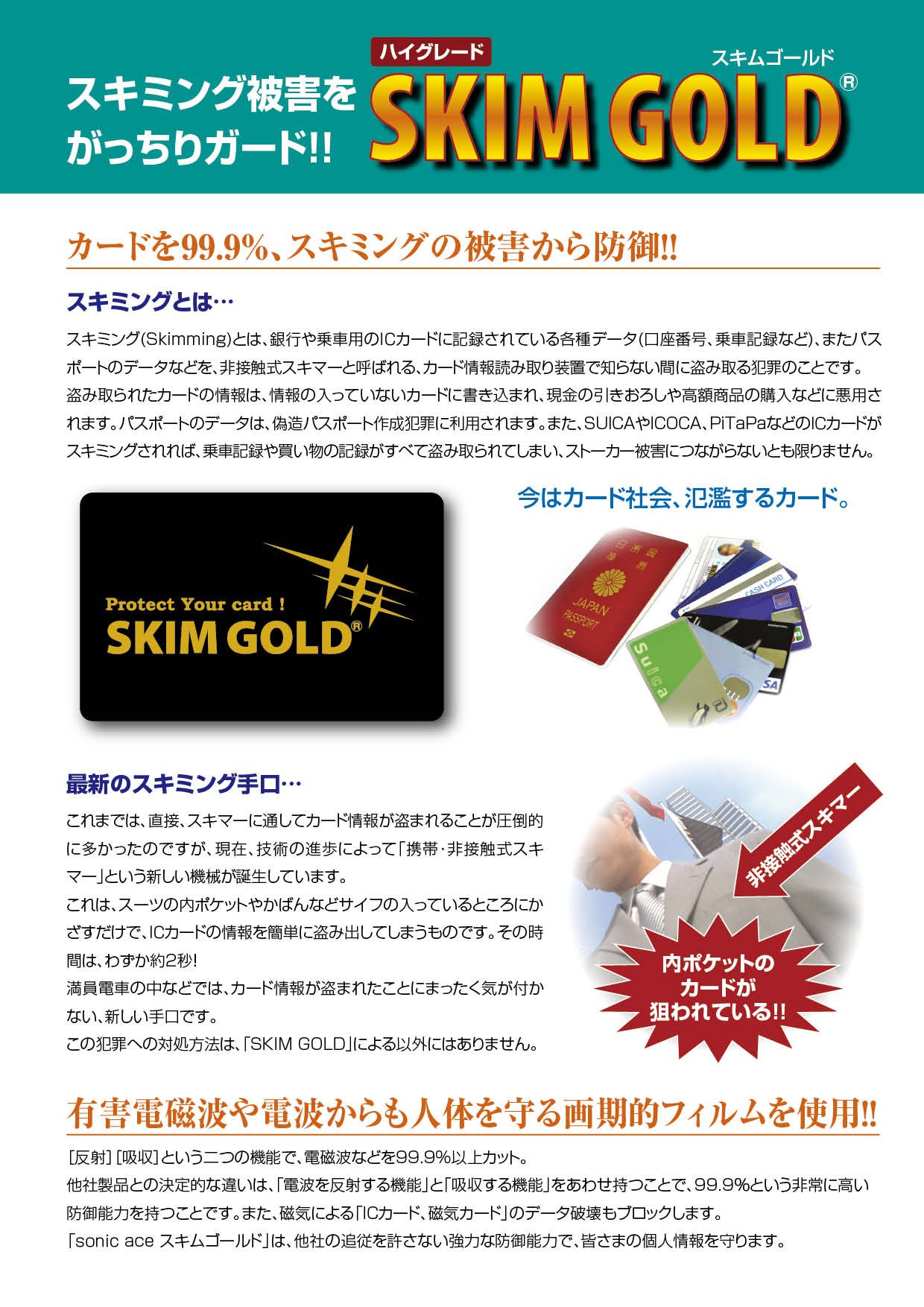 It is a powerful "information defense card" that guards IC transportation cards, cash cards, passports etc. from a malicious skimming damage suddenly.