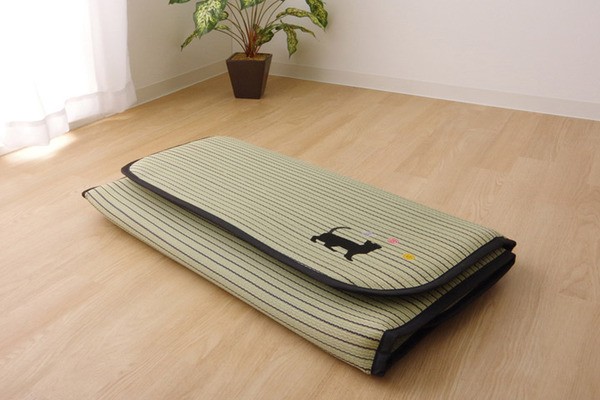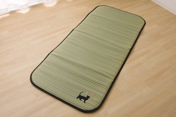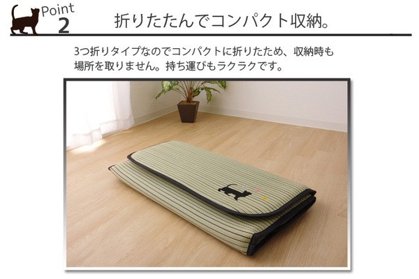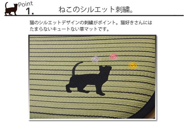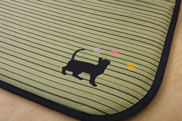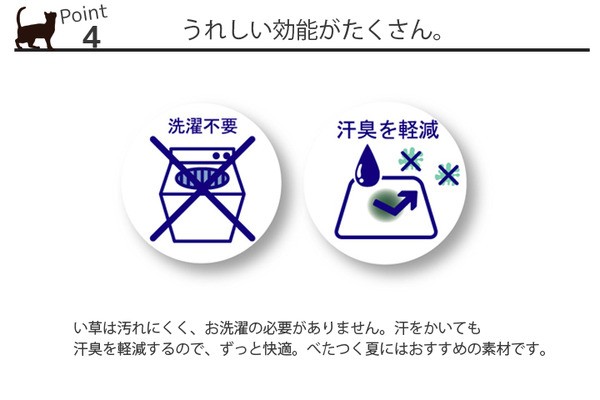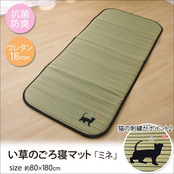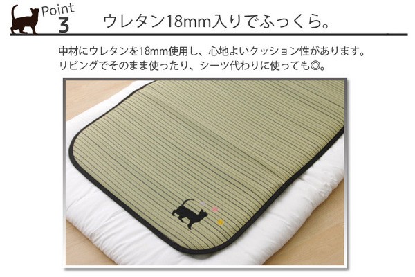 ネコを刺繍したかわいいデザインのイ草ごろ寝フリーマットです。い草には1.綿の約2.5倍の吸湿性があり汗のじめじめを軽減します。2.湿度の調整作用があり、蒸れにくく快適な就寝を促します。3.汗のにおいの元となる化学物質を90%以上抑え、においを軽減します。などの効果があります。中材にはウレタンフォーム18mmを使用していますので適度なクッション性があります。イ草表面に青森ヒバ加工を施しています(抗菌・防臭効果)。青森県のヒバの木から抽出した「ヒバ油」をメーカー独自の技術で材料や商品に加工しました。「ヒバ油」には、ヒノキチオールという天然物質としては極めて抗菌性の高い成分が含まれ、医療や食品など多分野で利用研究が進められています。※自然素材であること、また職人が一つ一つ手作業にて加工を行うため、形状のバラつきや表示サイズと多少異なることがあります。ご了承下さい。