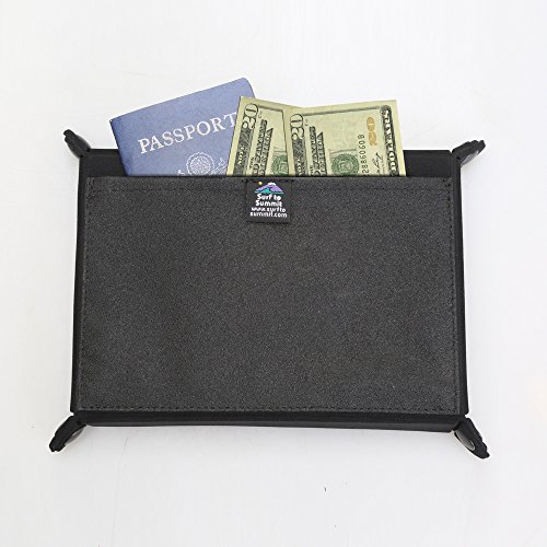 -. Binding : Home -. Brand : Surf To Summit -. Color : Black -. EAN : 0683804641725 -. Feature : Keep your small items handy and organized as you travel / Corners snap together forming 6" x 8.5" x 1.5" tray / Unsnaps to a flat 8.5" x 11" sheet for easy storage / Bottom pocket doubles as nonslip surface / Durable molded foam and heavy duty snaps. MADE IN THE USA -. Label : Surf To Summit -. Manufacturer : Surf To Summit -. Model : CTT001 -. MPN : CTT001 -. PackageQuantity : 1 -. PartNumber : CTT001 -. ProductGroup : Home -. ProductTypeName : HOME -. Publisher : Surf To Summit -. Size : 6" x 8.5" and 8.5" x 11" when flattened -. Studio : Surf To Summit -. Title : Collapsible Travel Tray Black Jewelry Nightstand Tray Collapsible Travel Tray Storage Portable Kids Wallet Cell Phone Money Keys Passport Documents Organizer Business Traveling Surf to Summit -. UPC : 683804641725