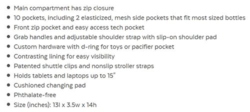 The updated Duo Signature boasts a bevy of new features that moms and dads have requested. The new zip-top closure ensures belongings stay securely in the bag. We added tote handles for versatility and an easy-access tech pocket. The new front panel design allows for more storage and stability while keeping items at the bottom of the bag easily accessible. . The Duo Signature still has all the classic components of the original including our patented shuttle clips that easily convert it from a shoulder bag to a stroller bag. Signature is a classic redesign for the next generation of parents.