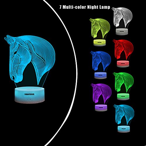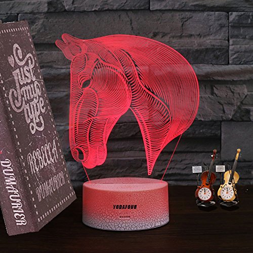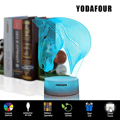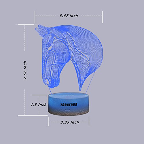Studio : YODAFOUR Publisher : YODAFOUR Binding : Kitchen Product Description Specific Base color: White Assembly size: 7.52inch(H) X 5.67inch(W) X 3.35inch(Dia.) Light board thickness: 0.157 inch Package include 1X Horse head image 1X White Crackle lamp base 1X USB cable 1X user mannual Features 1. The light board of this 3D animal night light made in Acrylic, which is strong, not fragile as glass, will not hurt the child, but please also take note don't drop it from high position even it is toughness, the features of the acrylic can make the light pass through the acrylic easily, make the light looks more pure, amazing, magical 2. Laser engraving technology, make the image never fade. 3. This optical illusion lamp make trick on your eyes, it is a flat acrylic plate in actual, but it will generate 3D optical visual illusion when lit up at night,when you see it from afar, you will see the 3D effect, but as you get little close, you only see a thin acrylic plate with an image on it, sometimes this also according to the users, different people have different feeling, even somebody think it is only 2D, but what dose it matter, it can bring you convenience at night and you like it, it is enough 4. This 3d night lamp with vividly animal image, can be good choice for animal lover collection 5. Can use you home adapter to match with, also can plug it into a USB socket with the USB cable directly,also can use 3-AA batteries to power. 6. If you have any problem during using, please contact us directly, we will service for you and solve your problem as soon as we can. NOTE 1. Please tear off the protection film on the surface of the acrylic before using, when you saw there is scratches, please check if you had teared the protection films, because the scratches always on the protection films only, not actually on the plate itself. 2. The parcel only coming with USB cable, wide used, no adapter 0 |