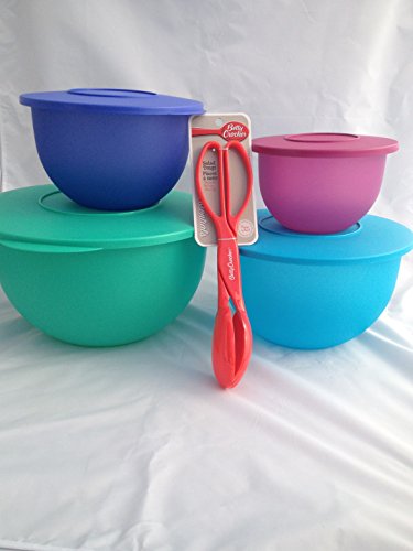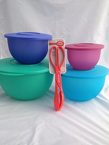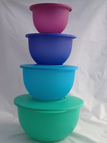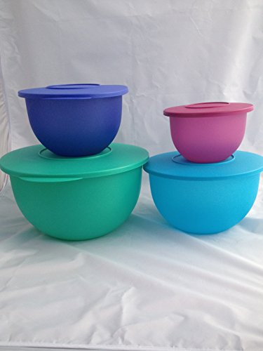 Includes four attractive color Tupperware Impressions bowls: one Radish 5.5 cup/1.2L Small, one Lupine (purple) 10 cup/2.5L Medium, one Cool Aqua 18 cup/4.2 Large and one Sea Green 32 cup/7.5L Extra Large