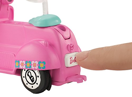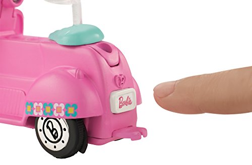 -. Feature : Barbie On the Go small doll and her scooter can really drive -- all on their own! / Push the button on the back of the vehicle to start it rolling. The motorized action is battery powered, and the button looks like a license plate with the Barbie logo on it for signature style / Barbie small doll has flexible hips and knees that allow her to sit and a head that bobbles with movement. A clip on the scooter holds her in place / The 4-inch doll has on a unique outfit with pink shorts, a colorful top with decal, white sneakers and a pink removable helmet that matches her scooter. The pink vehicle has blue accents, flower decals and silvery wheels / Collect all of the Barbie On the Go toys and accessories to inspire imagination and build a world to explore (each sold separately, subject to availability)