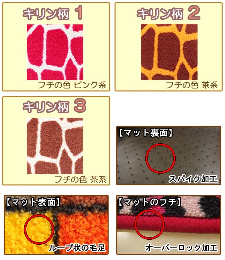| ■生地詳細 | ・厚み: 約10mm ・色 : キリン柄3種からお選び頂けます。 ・裏面: スパイク状となっており、大変滑りにくくなっております。 |