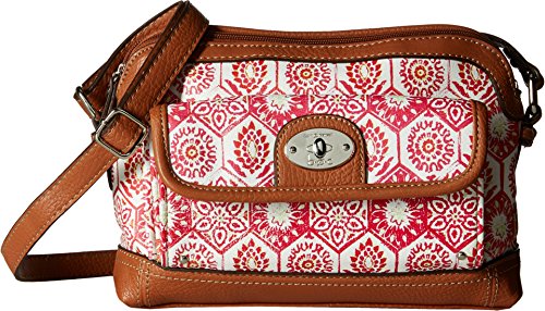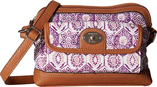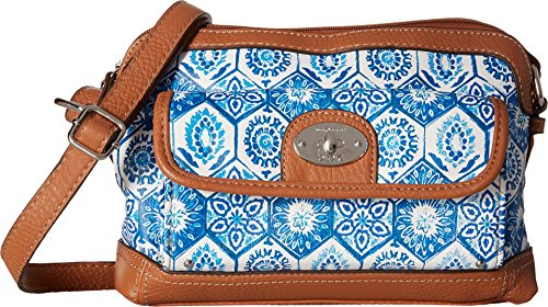 Dual-zip closure. Adjustable crossbody strap. Exterior features magnetic snap closure pocket with decorative hardware and additional patch pocket. Flat bottom base. One interior zip pocket including two slip pockets. Imported.