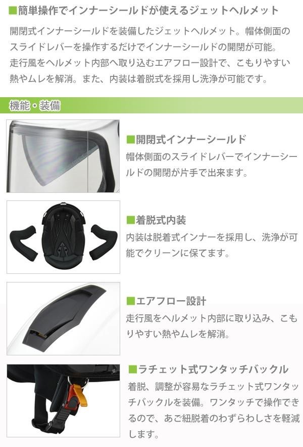 | 開閉式インナーシールドを装備したジェットヘルメット。帽体側面のスライドレバーを操作するだけでインナーシールドの開閉が可能。走行風をヘルメット内部へ取り込むエアフロー設計で、こもりやすい熱やムレを解消。また、内装は着脱式を採用し洗浄が可能です。 |