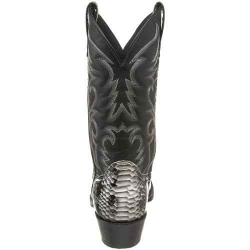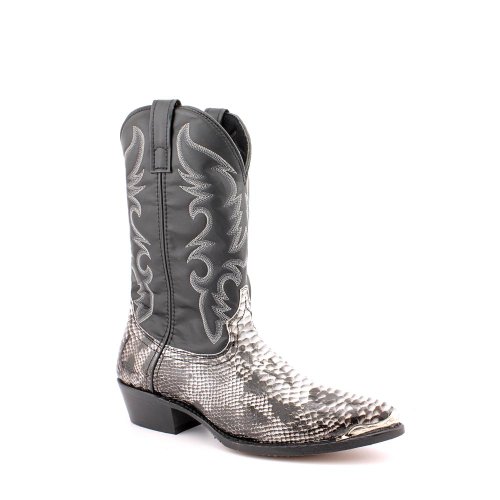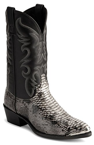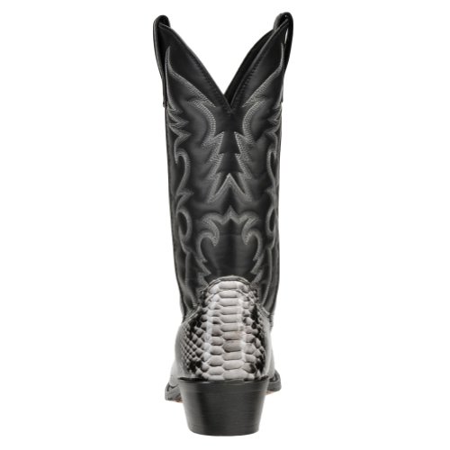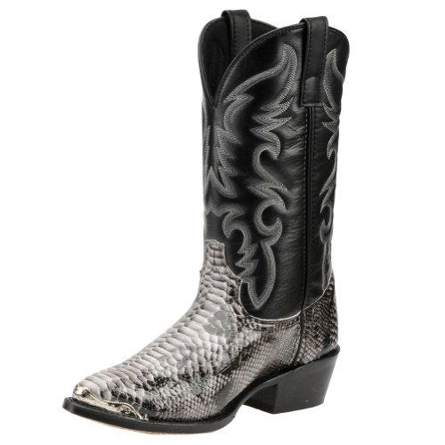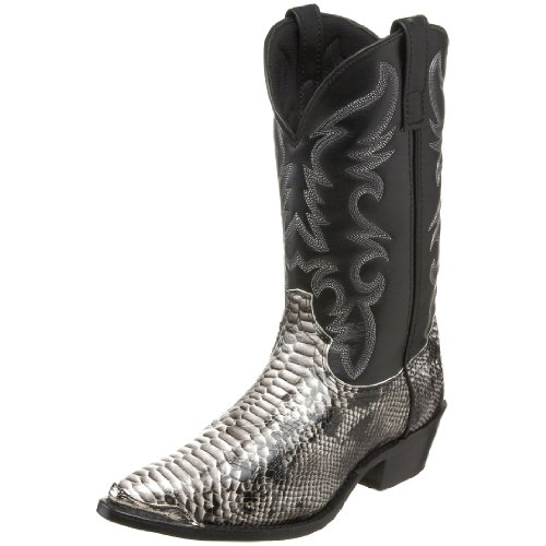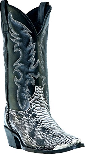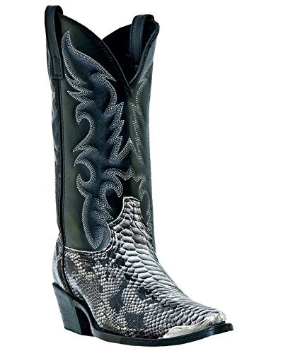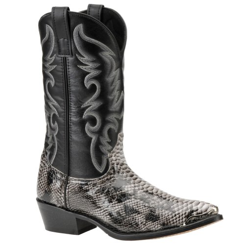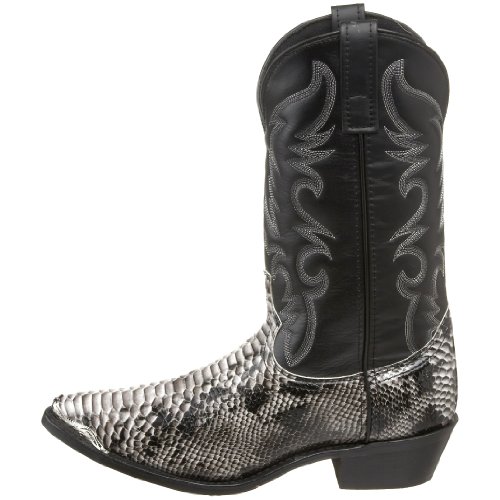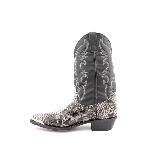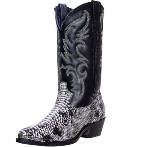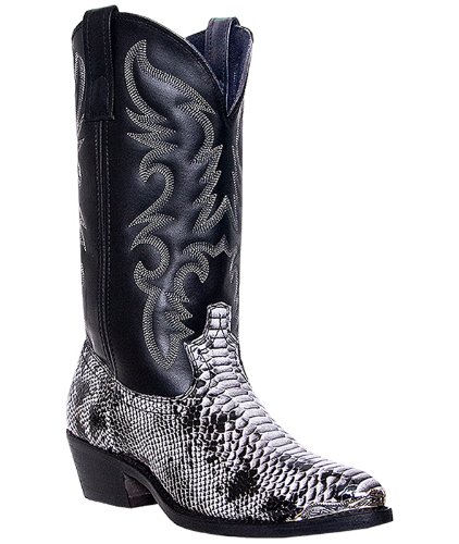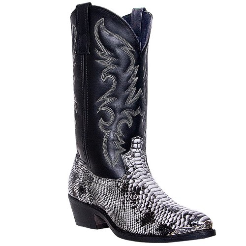 Product Description design 68067. Black White Snake Print Foot. Black Leather-Like Top. 12" Height. J Toe. Laredo Flex Outsole. Cowboy Heel. D 7-13. EW 8-13.