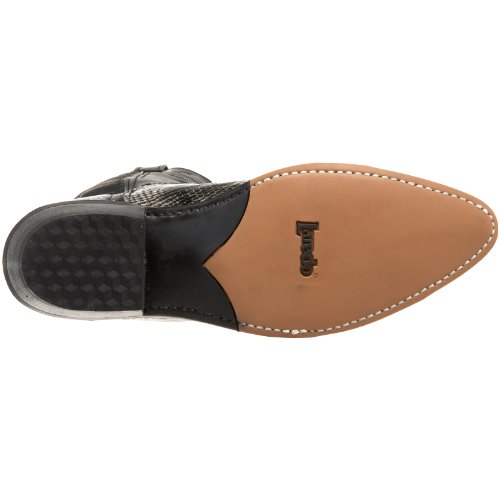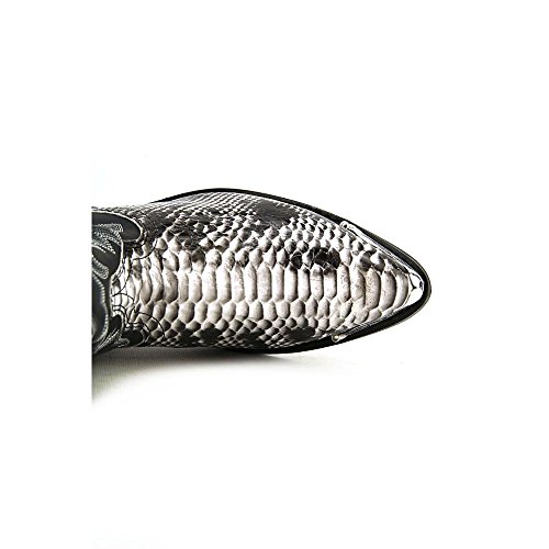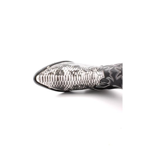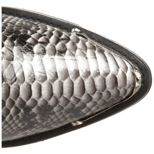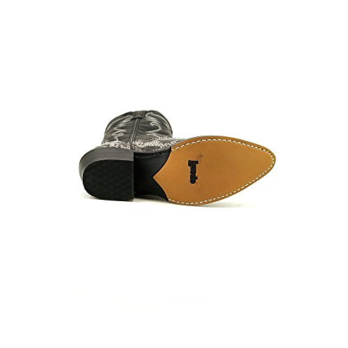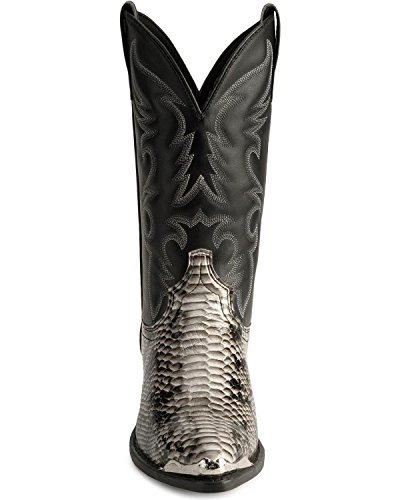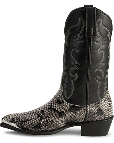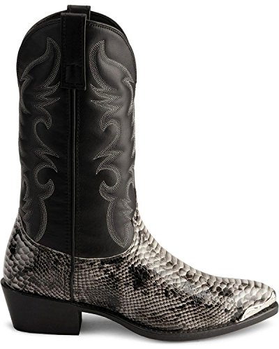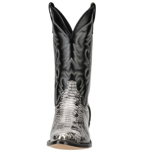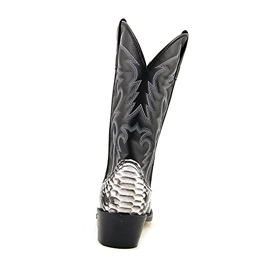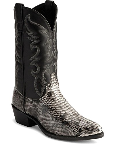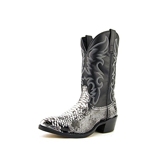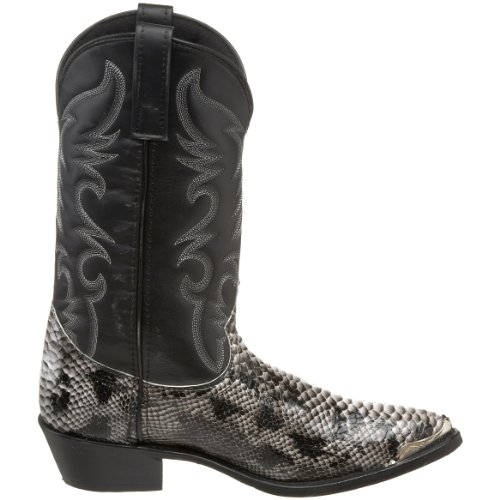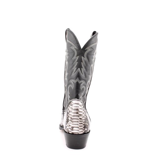 Product Description design 68067. Black White Snake Print Foot. Black Leather-Like Top. 12" Height. J Toe. Laredo Flex Outsole. Cowboy Heel. D 7-13. EW 8-13.