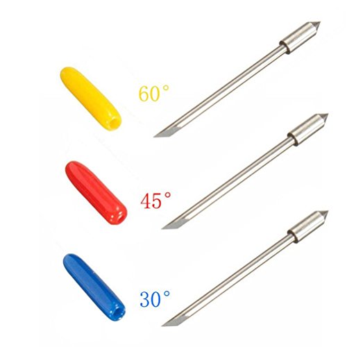 Usage: 30° Blades (Blue cap) for Cutting large fonts and thick materials which about 1mm. (e.g.: reflective material, masking tapes, etc.) 45° Blades (Red cap) for Cutting general fonts and vinyl film. (e.g.: vinyl for traffic sign, flocks, etc.) 60° Blades (Yellow cap) for Cutting very small font intricate line-art logos. (e.g.: any thin vinyl)