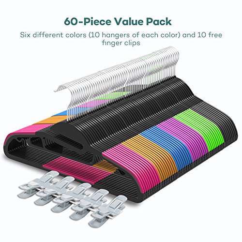 Clothes Hangers Space Saving Ultra Thin, Sable 60 Pack with 10 Finger Clips, Non Slip, Heavy Duty, S-Shape for Tight Collars, 6 Flashy Colors for Shorts, Pants, Shirts, Scarves