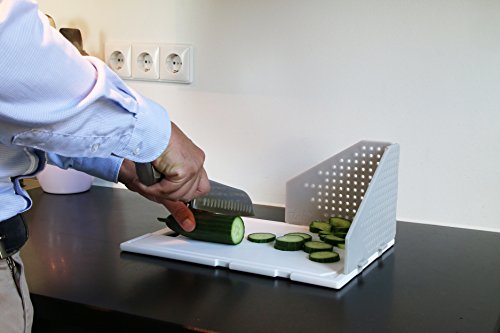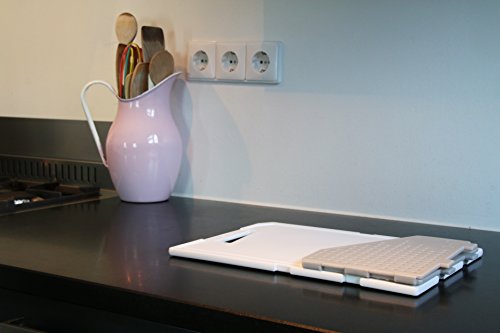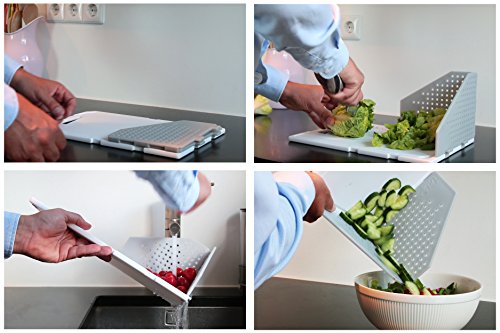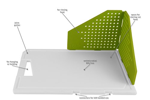 UNIQUE COLLANDER & CUTTINGBOARD combination with removable FOOD COLLECT CORNER, which also makes it easier to slide cut food into a bowl. BPA Free Antimicrobial. Dutch Design (Green add on)