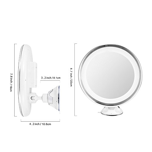 Specifications: Material: plastic and glass Size: diameter 7.87''/20cm Color: Silver (front) + White (back) Light: White Magnification: 7X Battery: 3*AA battery (not included) Application: Press the suction cup on a clean and flat glass firmly, 360-degree rotating. Cleaning method: wipe it with wet cloth Please note that it is a magnifying mirror, there is no standard mirror view.