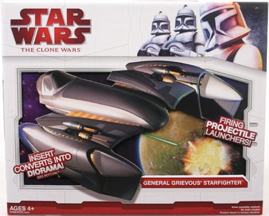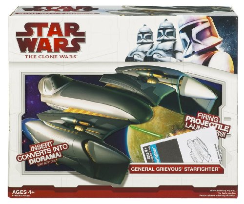 -. Binding : Toy -. Brand : Star Wars -. Color : Gray -. EAN : 0653569408697 -. Feature : Designed after the assault fighter as seen in the animated series / This vehicle features firing projectile launchers and a rotating vector fin / Vehicle has an opening canopy and retractable landing gear / Includes vehicle, missiles, labels and instructions / Some assembly required -. IsAdultProduct : 0 -. Label : Hasbro -. Manufacturer : Hasbro -. Model : 87890 -. MPN : 87890 -. PackageQuantity : 1 -. PartNumber : 87890 -. ProductGroup : Toy -. ProductTypeName : TOYS_AND_GAMES -. Publisher : Hasbro -. Size : Standard -. SKU : CHAR-STAW-PLAS-GENERAL_GRIEVOUS_2009_STA -. Studio : Hasbro -. Title : Star Wars Clone Wars Star Fighter Vehicle - Grevious -. UPC : 653569408697