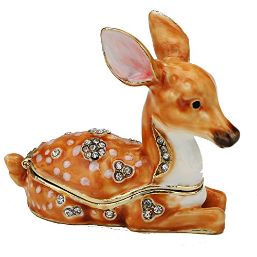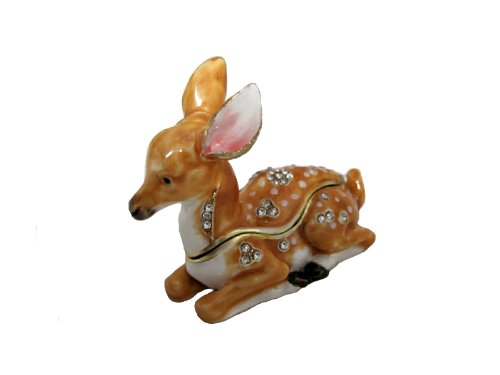 Measures 3 inches. Exquisite fawn figurine is also a trinket box which opens to reveal a storage compartment that's completely finished in a glossy enamel.