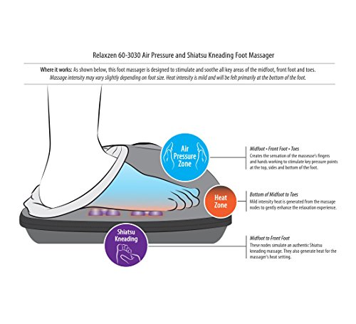 ReleaseDate : 2017-10-03 Studio : Comfort Products, Inc. Publisher : Comfort Products, Inc. Binding : Health and Beauty Product Description The 60-3030 Air Pressure and Shiatsu Foot Massager is your personal on-call therapist, no appointment necessary. This massager is designed to provide Shiatsu and Air Pressure primarily to the midfoot, front foot and toes. Its inner material envelops your feet in relaxing pillow-like comfort even before you start your massage. Once you're ready, there are 7 highly useful settings: Auto for Shiatsu with Air Pressure, Shiatsu Only, Air Pressure Only, High and Low Intensity Air Pressure, Heat, and Stop. Touch any massage setting button to turn it on. The default is Auto for both Shiatsu kneading and Air Pressure. Or, you can select these separately. With either choice, you have Low or High intensity options for just the right amount of air pressure. Prefer spa-like warmth to enhance the experience? Simply select Heat. For your safety, the Stop button turns it off immediately, and Auto is set to a 10-minute timer. And the washable outer soft cloth unzips and removes with ease. It's compact, lightweight, and extremely soothing. Considering the price, this is powerful little foot massager proves that big things do come in small packages. Offered by Relaxzen, an early innovator in massage seating, and part of Comfort Products family. With a history dating back to 1919, Comfort Products makes design and innovation affordable. 0