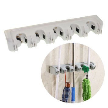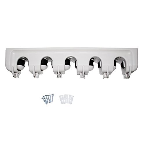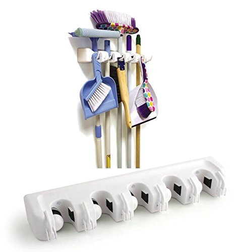 - Feature : IS 100% BRAND NEW BROOM HOLDER MADE OF HIGH QUALITY ABS PLASTIC. QBROOM will hold your daily appliances without you being worried it will break apart. We ensure you that each of our item is made from high quality material and had gone through inspection to make sure that the item we sent to your house is a durable one. / 5 POSITION HOLDERS. With QBROOM!!! You can use it to hold and organize many household items like broom, mop, Swiffer mops, Wet Jet, sponge mops, floor waxers, dusters, dustpans or any other tools like hammer and sports equipment even power tool. Very useful as broom holder, mop holder, broom wall organizer / 6 HOOK HANGERS. Your tool don't have any handle. Nooooo problem because you can hang it. Brush, hoses, fry pan, saucer even glasses or any other cooking utensil could easily fit in our utility hook. / Our included 6 SCREWS,6 PLASTIC SCREW PLUGS parts means that you don't have to bother going to store again and finding the right screw.we give you free in our package. This included parts also makes QBROOM can be installed not only in closet but can ALSO USE it in kitchen, utility room, laundry and gardening area.