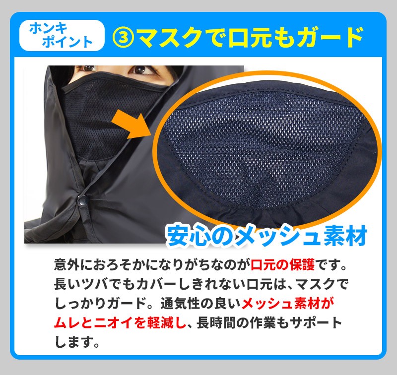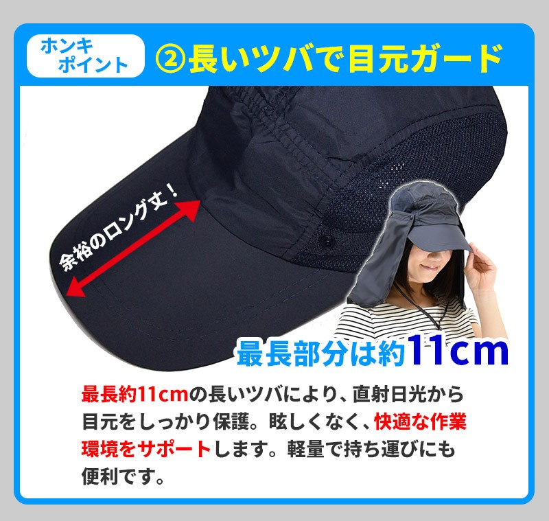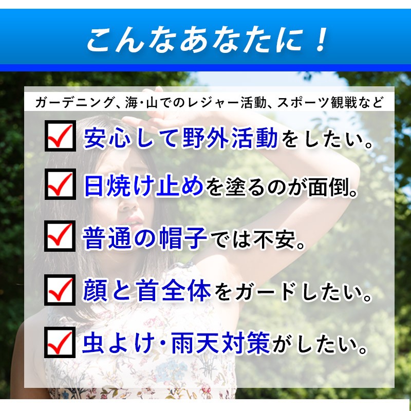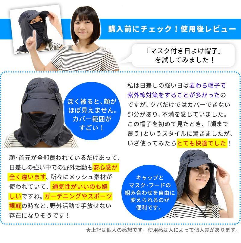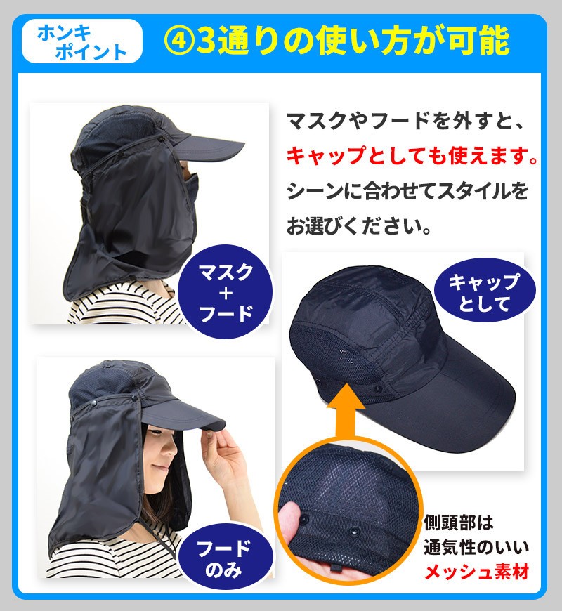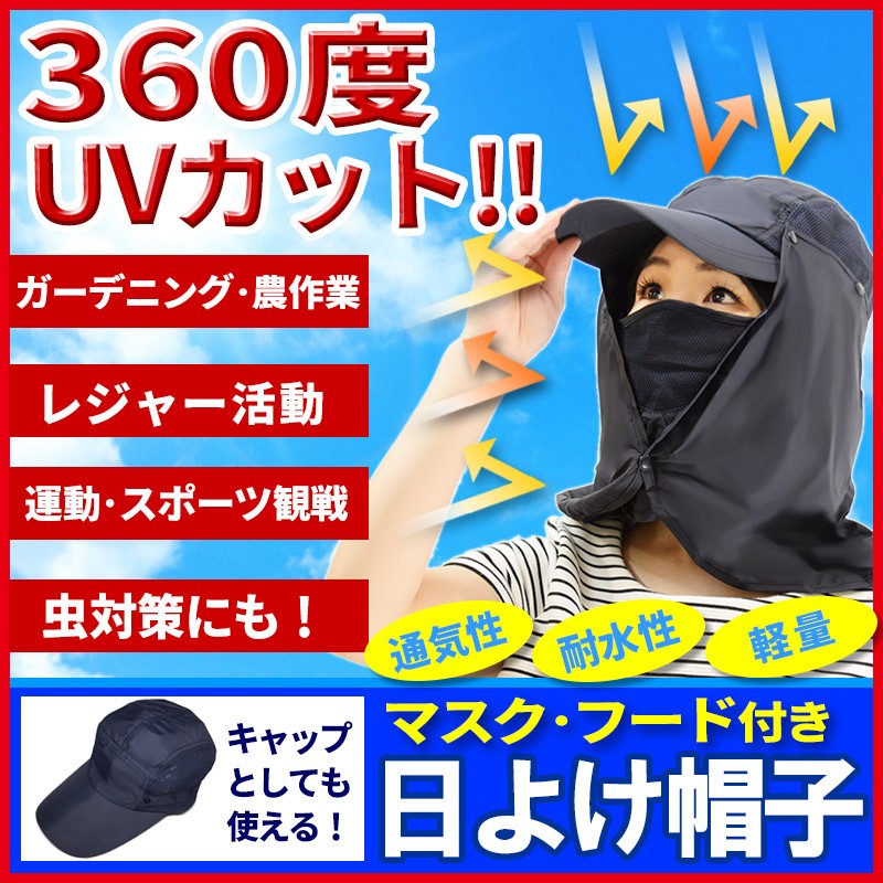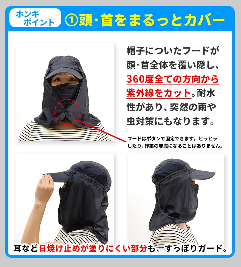 ━━━━━━━━━━━━━━ 360度UVカット! マスク・フード付き日よけ帽子 ━━━━━━━━━━━━━━ 日差しがキツイ季節!紫外線対策は、美容と健康のためだけでなく、 想定外のトラブルを防ぐためにも重要です。 これからの季節は、通気性・耐水性・多機能性を兼ね備えた「マスク・フード付き日よけ帽子」で、頭・目・鼻・口・耳・首すべてを「まるっと」ガードしましょう! ━━━━━━━━━━━━━━ こんなあなたにオススメ! ━━━━━━━━━━━━━━ ●ガーデニング・農作業・家庭菜園・スポーツ観戦などの野外活動が多い。 ●日焼け止めを塗るのが面倒。 ●普通の帽子では不安。 ●顔と首全体をガードしたい。 ●手軽に紫外線対策を始めたい。 ●海・山などレジャー活動をしたい。 ●普段使いできる日よけ帽子がほしい。 ●虫や雨天対策をしたい。 マスク・フード付き日よけ帽子で「ホンキの紫外線対策」を始めませんか? ━━━━━━━━━━━ ホンキポイント【1】 頭・首をまるっとカバー ━━━━━━━━━━━ 帽子についたフードが 顔・首全体を覆い隠し、 360度全ての方向から 紫外線をカット。鼻・耳などの日焼け止めを塗りにくく、日焼けしやすい部分も全てカバーします。フードはボタンで固定できるため、 ヒラヒラしたり、作業の邪魔に なることはありません。またフード部分は耐水性・速乾性があり、水ハネや突然の雨も安心です。 ━━━━━━━━━━━ ホンキポイント【2】 長いツバで目元ガード ━━━━━━━━━━━ 最長約11cmの長いツバにより、直射日光から 目元をしっかり保護。眩しくなく、快適な作業 環境をサポートします。 ━━━━━━━━━━━ ホンキポイント【3】 マスクで口元もガード ━━━━━━━━━━━ 意外におろそかになりがちなのが口元の保護です。 長いツバでもカバーしきれない口元は、マスクで しっかりガード。通気性の良いメッシュ素材が ムレとニオイを軽減し、長時間の作業もサポート します。 ━━━━━━━━━━━ ホンキポイント【4】 3通りの使い方が可能 ━━━━━━━━━━━ マスクやフードを外すと、 キャップとしても使えます。 シーンに合わせてスタイルを お選びください。キャップの側頭部は通気性のいいメッシュ素材です。 ━━━━━━━━━━━ ホンキポイント【5】 各パーツの脱着が簡単 ━━━━━━━━━━━ マスクやフードはボタンで 付いているため、手で簡単に 外すことができます。あご紐はフックを 外すと取れます。 ━━━━━━━━━━━━━━━━ 購入前にチェック!使用後レビュー ━━━━━━━━━━━━━━━━ 私は日差しの強い日は麦わら帽子で 紫外線対策をすることが多かったの ですが、ツバだけではカバーできない 部分があり、不満を感じていました。 この帽子を初めて見たとき、「顔まで 覆う」というスタイルに驚きましたが、 いざ使ってみたらとても快適でした! 深く被ると顔が ほぼ見えません。とにかく カバー範囲が すごい!顔・首元が全部覆われているだけあって、 日差しの強い中での野外活動も安心感が 全く違います。所々にメッシュ素材が 使われていて、通気性がいいのも嬉 しいですね。キャップと マスク・フードの 組み合わせを自由に 変えられるのも多機能で便利だと思いました。ガーデニングやスポーツ 観戦の時など、野外活動で手放せない 存在になりそうです! ★上記は個人の感想です。使用感は人によって個人差があります。 ━━━━━━ 商品仕様 ━━━━━━ 【色】ネイビー 【サイズ】フリーサイズ(大人向け・男女兼用) 【各パーツサイズ詳細】 ●キャップ部分 頭幅:約20cm(後頭部の止め具とゴムにより多少の調節が可能) 高さ:約13cm ●フード部分 縦:約29cm 横:約64cm ●マスク部分 縦:約17.5cm 横:約33.5cm ●あごひも 全長:約74cm(止め具で調節可能) ●素材 :90%ナイロン、10%ポリエステル ●重量 : 約120g ●原産国 : 中国 |