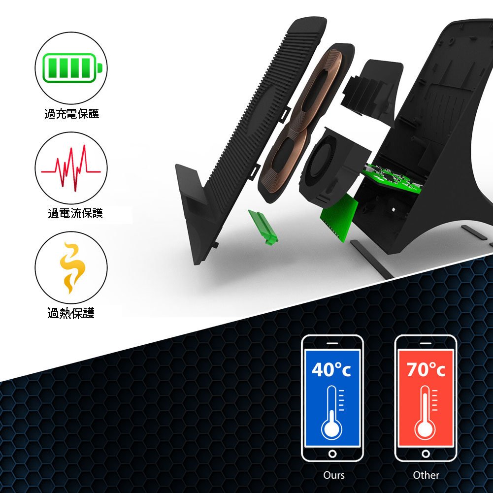 This wireless charger is strongly blown by a cooling fan, and it has excellent heat radiation performance