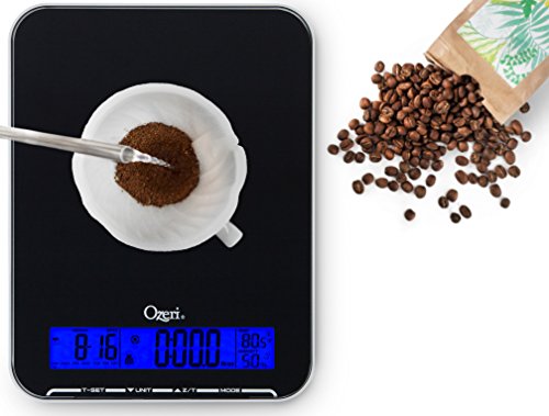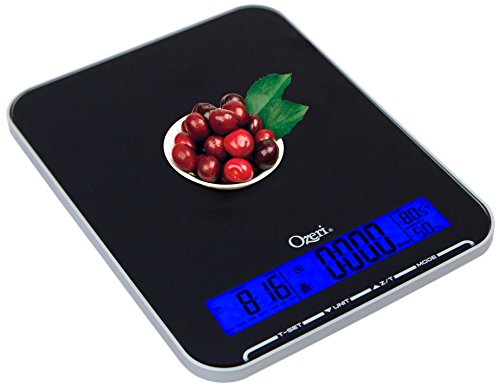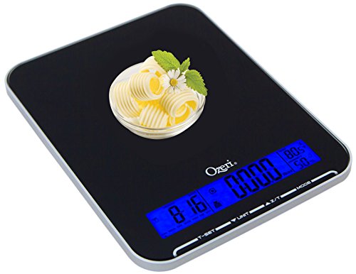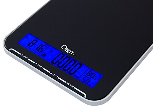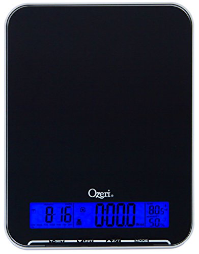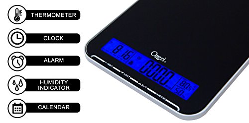 Ozeri Touch III 22 lbs (10 kg) Kitchen Scale in Tempered Glass, with Clock, Calendar, Temperature & Humidity Gauge