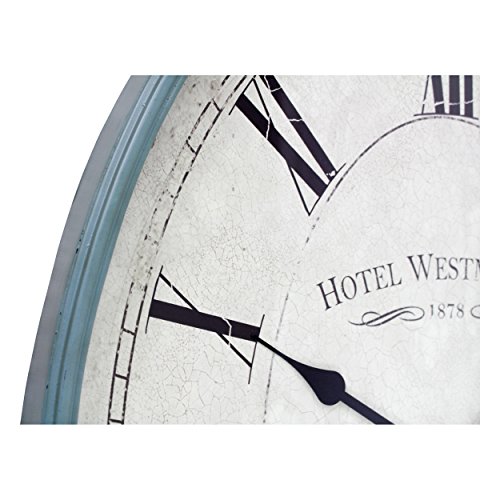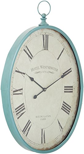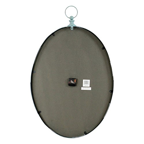 -. Feature : Dimensions: 37.5L x 23.5W x 2.5D in. / Iron / Distressed teal finish / Oval shaped wall clock / Roman numerals