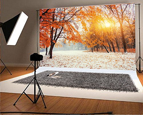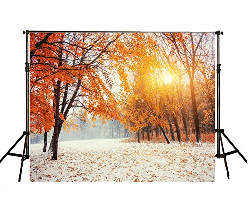7x5 ft Sunset Red Maple Leaves Snow Photography Backdrop Background