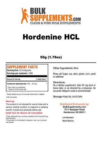 Studio : Bulksupplements Publisher : Bulksupplements Binding : Health and Beauty Product Description Hordenine HCL is a naturally occurring alkaloid that is chemically similar to phenylethylamine. In addition to providing an energy boost, Hordenine is regarded for having several cognitive benefits such as focus and concentration. This supplement is bioavailable and can cross the blood-brain barrier. 0