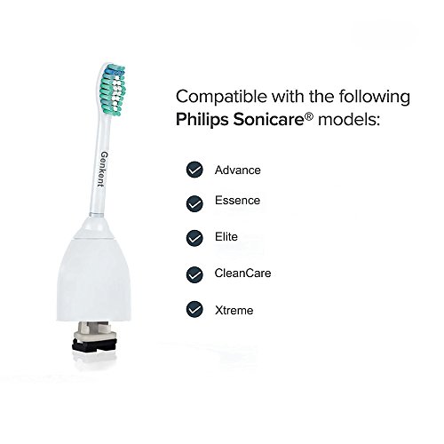 Studio : genkent Publisher : genkent Product Description Genkent Replacement Philips sonicare e series toothbrush heads is the Dentist's Highest Quality philips Compatible Toothbrush Head Replacements ,We want to make it easy for you to order the most effective Philips compatible replacement head on Amazon to help protect your teeth. These ESeries brush heads with screw-on system fit the following Philips Sonicare Electric Toothbrush Handles: Advance Essence Elite CleanCare Xtreme The replacement brush heads are compatible with all of the following handle models: HX3300; HX3351; HX3500, HX3551; HX3881; HX4002; HX4101; HX4011; HX4321; HX4772; HX4511; HX4572; HX4573; HX4772; HX4871; HX4872; HX5130; HX5251; HX5300; HX5310; HX5350; HX5351; HX5352; HX5400; HX5451; HX5500; HX5551; HX5581; HX5610; HX5611; HX5751; HX5752; HX5754; HX5810; HX5853; HX5910; HX7351; HX7361; HX7381; HX7551; HX7553; HX7800; HX7841; HX7881; HX9500; HX9552; HX9553; HX9562; HX9842; HX9882; etc. Dental professionals recommend: ? Replacing your brush head when the Blue reminder bristles fade ? Replacing your brush head every three months. Order now and add to cart Package: 6 Brush heads . You will receive Genkent Heads with hygienic travel caps Sealed Disclaimer:Our replacement toothbrush heads are not by Philips. We independently manufacture these generic replacement heads in order to provide a high quality replacement for various Philips toothbrush heads. 0
