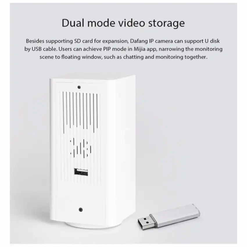 Xiaomi dafang HD Smart IP Camera 6pcs 940nm infrared LEDs are added for security guarantees at night or in dark places. High speed PTZ Dafang IP camera supports 1080P resolution, it has F 2.3 aperture lens, 120 degree viewing angle, by rotating the gimbal, it can take photographs by 360 degree or 93 degree, taking 3 seconds to check all state of your home. Intelligent auxiliary monitoring With the transaction image green frame mark , the gimbal will automatically track, watch home, watch baby and pets very conveniently. Night vision function Dafang IP camera is built in 6 pieces of 940nm infrared complimentary light, which can restore night vision scene in 18 order gray scale, meanwhile, it supports double way phone call, 87db restoring human voice, hearing the conversation in 10 meters. Dual mode video storage Besides supporting SD card for expansion, Dafang IP camera can support U disk by USB cable. Users can achieve PIP mode in Mijia app, narrowing the monitoring scene to floating window, such as chatting and monitoring together. Main Features: ● Built-in microphone and speaker, support two-way remote dialogue ● You can get to know the situation where you want to know by phone or tablet at anytime or anywhere ● Observe the photograph and video whenever necessary ● 120-degree wide-angle lens brings a sense of immersive screen ● Playback at anytime, in addition to real-time viewing, it can insert a SD memory card to store video for look at any time ● Please download APP "Mi Home" from Apple Store or Google Play Specification General Brand: Xiaomi Model: dafang Shape: Box Camera Technical Feature: Infrared IP camera performance: Interphone,Night Vision,Remote Control Motion Detection Distance: 9m Compatible Operation Systems: Android,IOS APP: Mi Home Interface: Micro USB Features: HD Network WiFi Distance : 10m System and Hardware Info Local-storage: SD card up to 32GB Language: English Maximum Monitoring Range: 9m FOV: 120 degrees Video Image Audio Video Resolution: 1080P Frame Rate (FPS): 15FPS Resolution: 1920 × 1080 Night Vision Infrared LED: 6 Physical Environment Waterproof: No Operate Temperature (℃): 0 degrees Celsius - 40 degrees Celsius Power Working Voltage: 5V Dimension and Weight Product weight: 0.2490 kg Package weight: 0.3800 kg Product size (L x W x H): 12.75 x 6.60 x 6.00 cm / 5.02 x 2.6 x 2.36 inches Package size (L x W x H): 16.00 x 11.00 x 11.00 cm / 6.3 x 4.33 x 4.33 inches Package Contents Package Contents: 1 x Camera, 1 x Cable, 1 x Adapter, 1 x Instruction