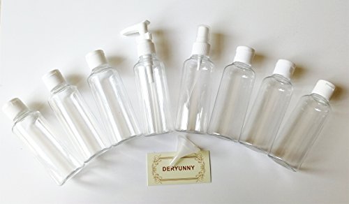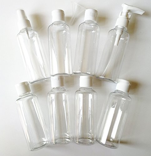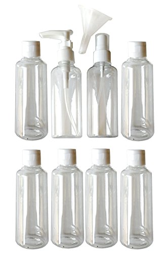 8 Pack Transparent Plastic Air Flight Travel Bottle Set with Small Funnel for Flight, Airport, Holiday Travel Accessories Small bottles Containers Leak Proof Portable (100 ML)
