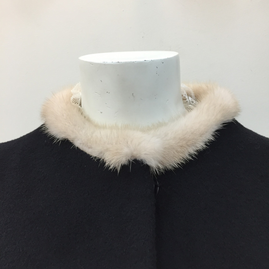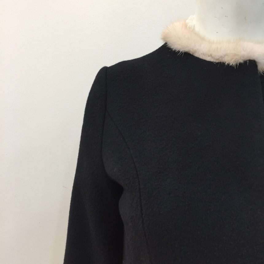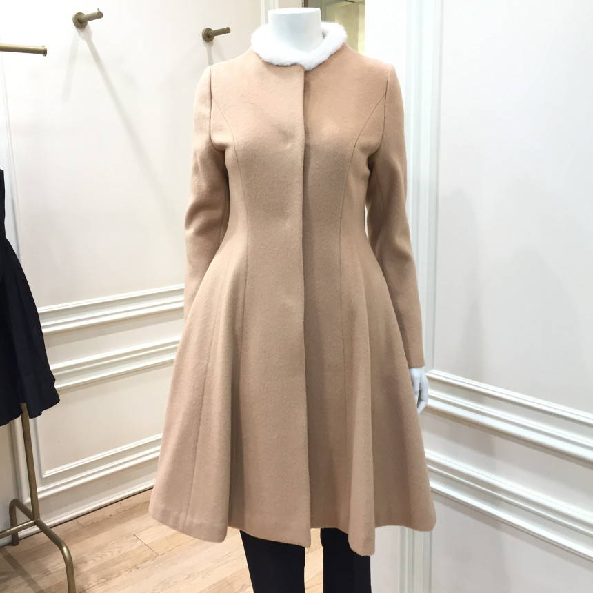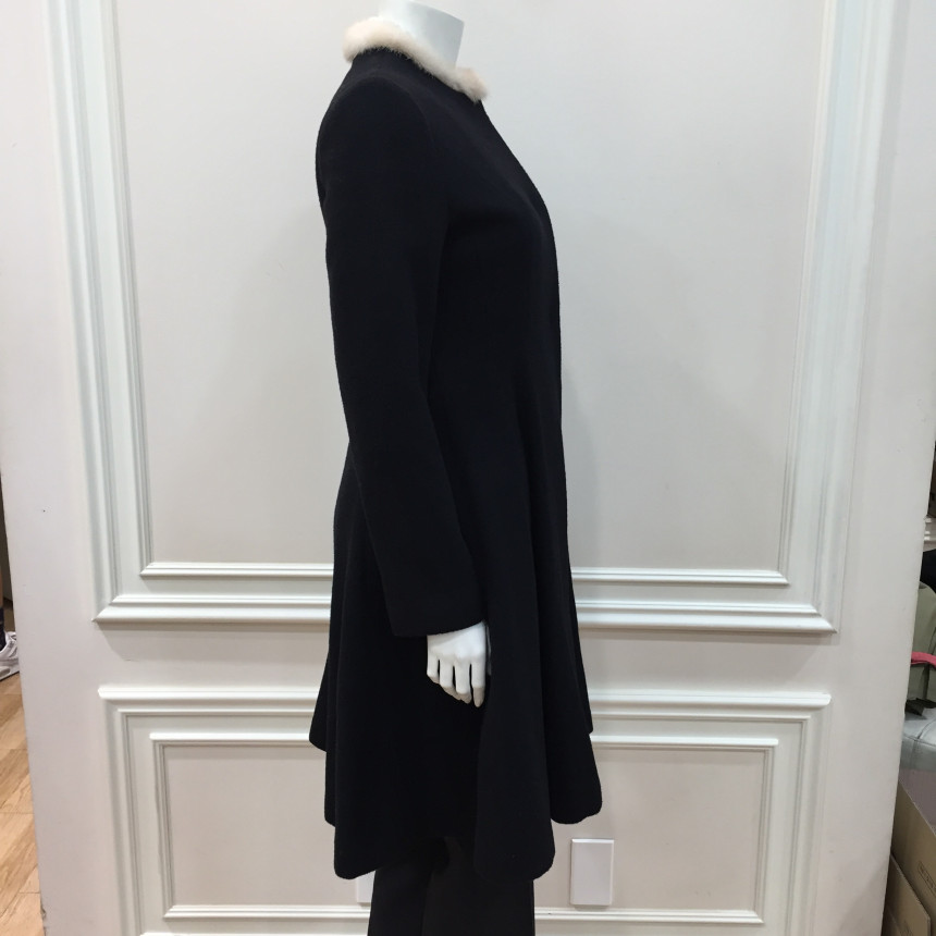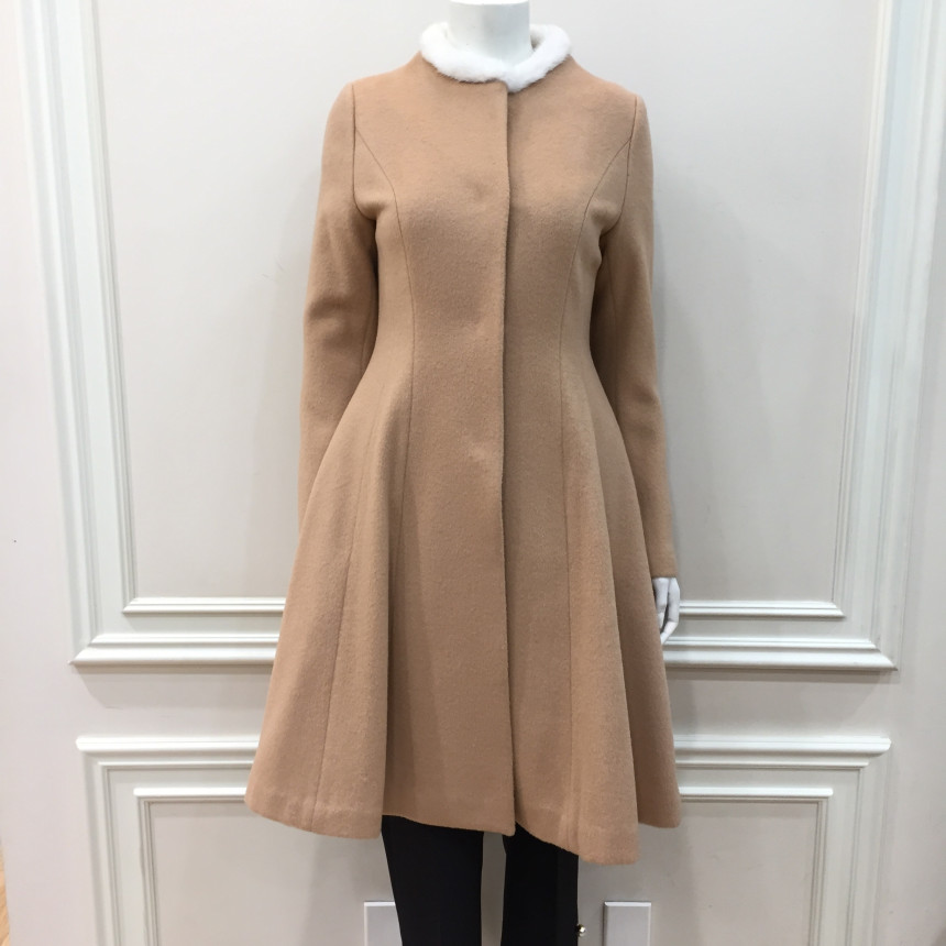 쁘띠 밍크퍼 넥 장식이 있는 핏앤플레어 실루엣의 겨울코트입니다.