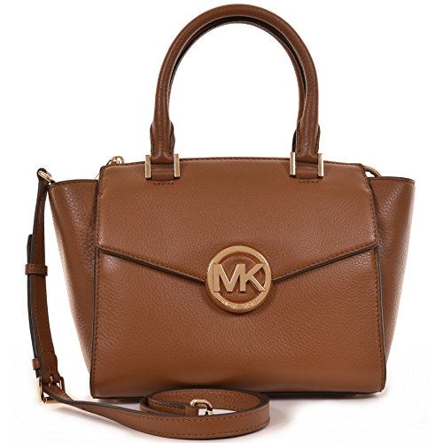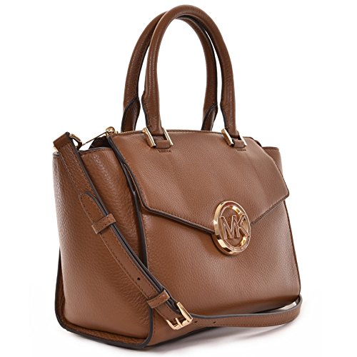 -. Brand : -. Color : Brown -. Department : womens -. EAN : 0888235791081 -. Feature : Genuine pebbled leather. Flap over with MK Logo snap closure. Gold tone logo and hardware. / Double rolled handles with 4.5" drop. Removable strap for shoulder or crossbody wear. / Main compartment with zipped closure. Interior lining, 1 zip pocket, 3 slips pocket. / Front compartment with magnetic snap flap closure. Back pocket with magnetic snap closure. / Approximate Dimensions: 13" x 8.5" x 6" -. PackageQuantity : 1 -. ProductGroup : Shoes -. ProductTypeName : HANDBAG -. Title : Hudson Medium Satchel Brown Leather -. UPC : 888235791081
