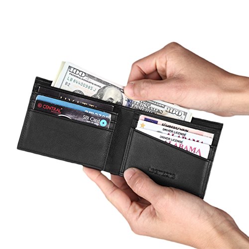 -. Feature : ✔With RFID Blocking function, Protect your personal information from stealing. / ✔MATERIAL: Top Grain Genuine leather very durable to use, Lining: Polyester. / ✔Compact Wallet for Men: It has 9 card slots, one ID window, 2 receipts holder, one big cash holder. Backside with one slot for bus card or metro card. / ✔SLIM DESIGN: The slim wallet can easily slips in and out of your pockets, not bulky at all, slim and organizer structure, get rid of your bulky wallet. This wallet is slim enough to hold it in palms and could be simply put into front&back pockets. For being accessed quickly at any time. / ✔1 YEAR WARRANTY: You can return this wallet if any defect caused during your use of this product. We can give you full refund or free replacement whichever is at your most convenience.