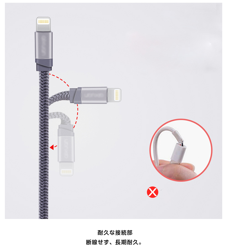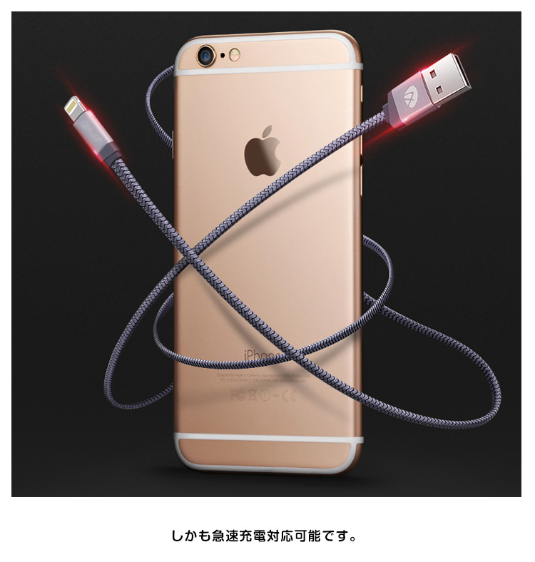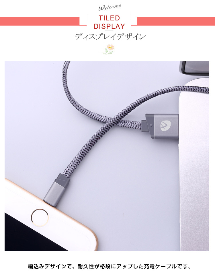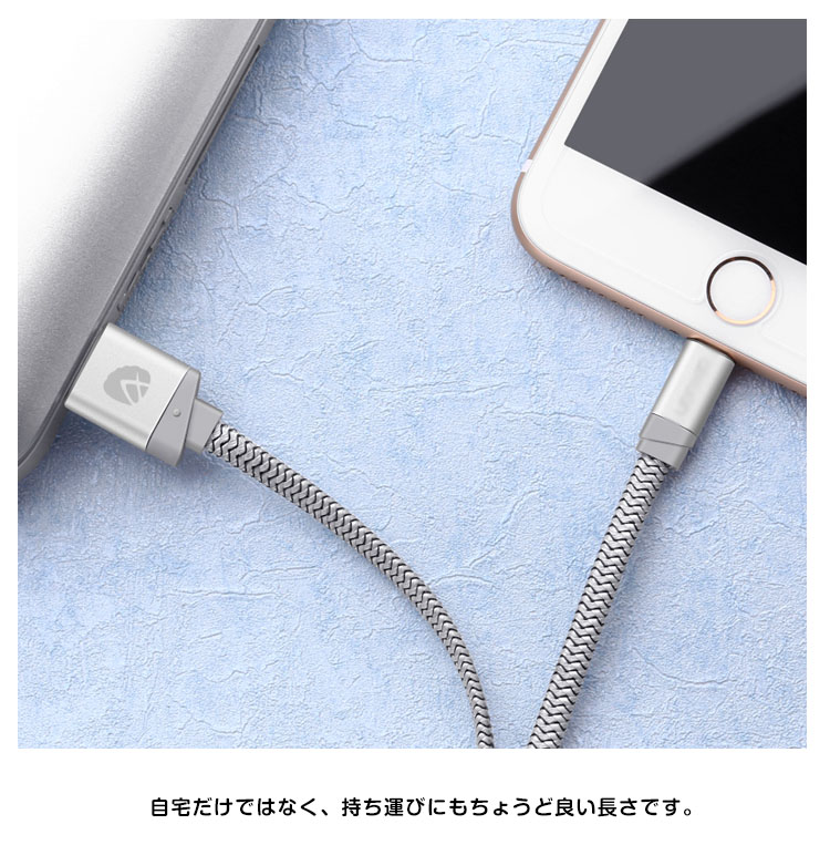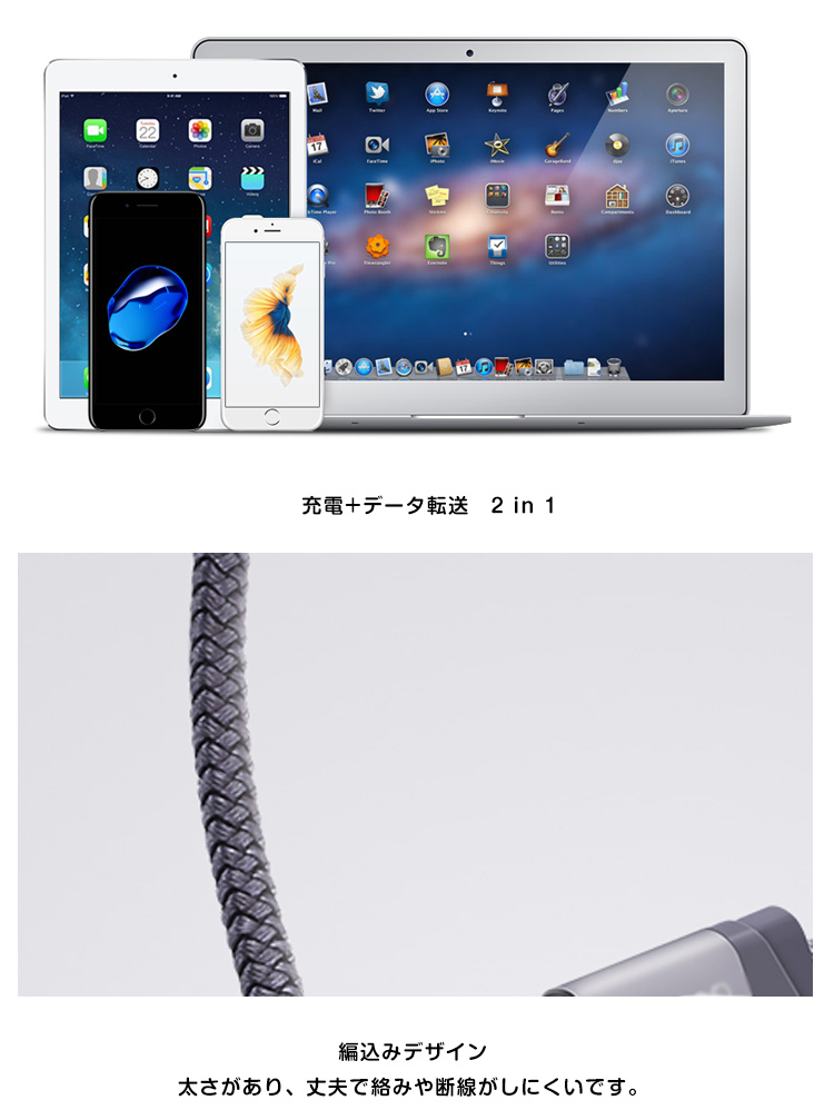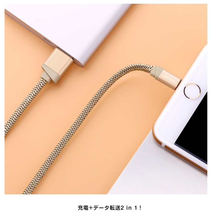 | 編込みデザインで、耐久性が格段にアップした充電ケーブルです。長さは適度な使いやすさの1メートル!自宅だけではなく、持ち運びにもちょうど良い長さです。充電+データ転送2 in 1! | |