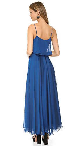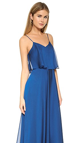 V-neck gown with slight sheen featuring ruffled bodice overlay and adjustable spaghetti straps