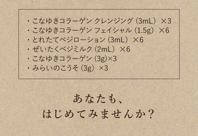 クレンジング:3mL×3包 / 洗顔パウダー:1.5g×6包 / 化粧水:3mL×6包 / 乳液:2mL×6包 / みらいのこうそ:3g×3包 / こなゆきコラーゲン:3g×3包