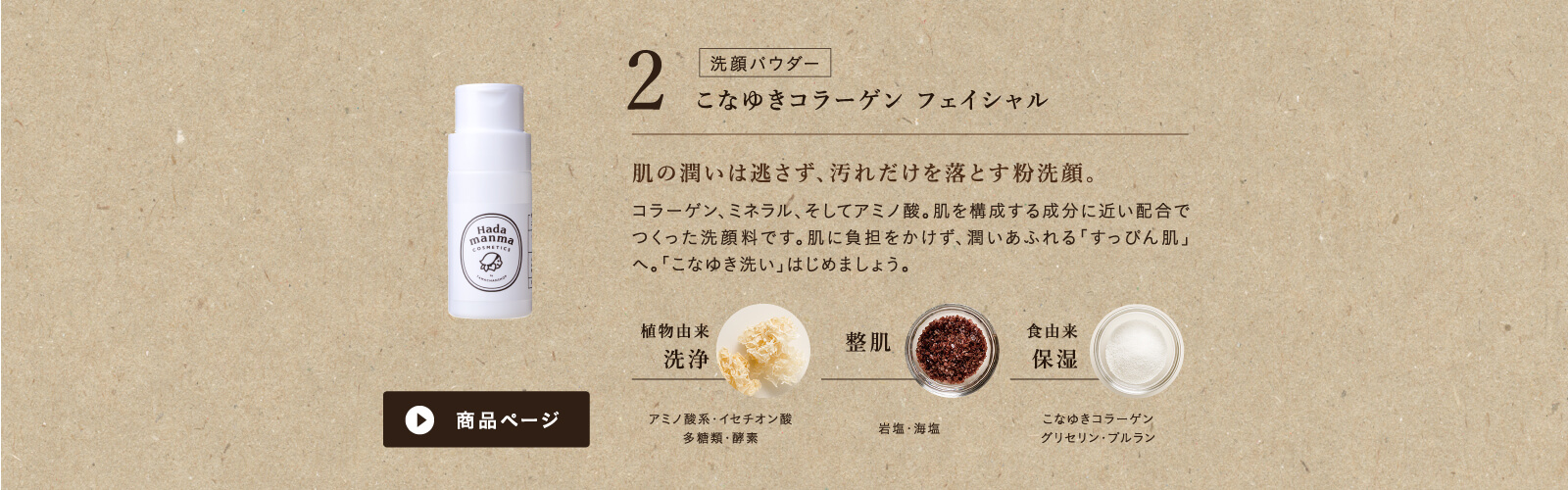 コーンスターチ、ラウロイルグルタミン酸Na、ソルビトール、ココイルイセチオン酸Na、ミリストイルグルタミン酸Na、塩化Na(紅塩)、海塩、加水分解コラーゲン、リン酸アスコルビルMg、パパイン、デキストリン、セイヨウミザクラ果実、マルトデキストリン、スクロース、プルラン、褐藻エキス、シロキクラゲ多糖体、ヒアルロン酸Na