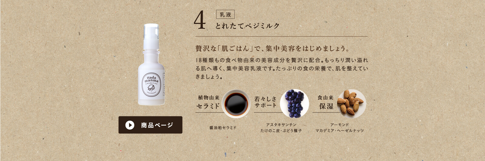 水、グリセリン、プロパンジオール、ホホバ種子油、トリ(カプリル酸/カプリン酸)グリセリル、スクワラン、ペンチレングリコール、シイタケエキス、スイセンジノリ多糖体、アーモンド油、マカデミア種子油、ヘーゼルナッツ油、ニンジン根エキス、野菜油、アスタキサンチン、ブドウ種子エキス、野菜油、アスタキサンチン、ブドウ種子エキス、マルトデキストリン、キハダ樹皮エキス、アンゲリカフルシジュガ花/葉/茎エキス、シソ葉エキス、加水分解ダイズエキス、豆乳発酵液、キビ芽エキス、ハトムギ種子エキス、コメエキス、デキストリン、ガゴメエキス、モウソウチクたけのこ皮エキス、セラミドAP、セラミドNP、PEG-60水添ヒマシ油、ニュウコウジュ油、ベルガモット果実油、ノバラ油、マカデミアナッツ脂肪酸フィトステリル、トコフェロール、ジステアリン酸ポリグリセリル-3メチルグルコース、水添ナタネ油アルコール、BG、カルボマー、水酸化K、カプリルヒドロキサム酸、1,2-ヘキサンジオール、カプリリルグリコール