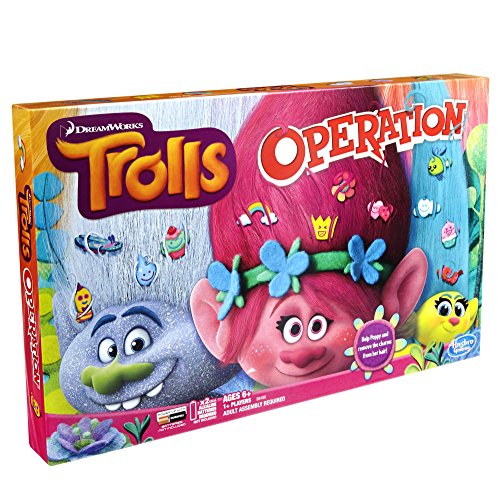 -. Binding : Toy -. Brand : Hasbro -. EAN : 0630509475049 -. Feature : Ditch the TV, and re-ignite family night with the get-together amusement of a Hasbro game / Party it up, and surprise guests at your next event with laugh-out-loud game from Hasbro Gaming / Nostalgic tabletop gameplay meets interactive digital content for an immersive gaming experience / Hasbro Gaming imagines and produces games that are perfect for every age, taste, and event -. IsAdultProduct : 0 -. Label : Hasbro -. Manufacturer : Hasbro -. Model : B9180 -. MPN : B9180 -. PackageQuantity : 1 -. PartNumber : B9180 -. ProductGroup : Toy -. ProductTypeName : TOYS_AND_GAMES -. Publisher : Hasbro -. Studio : Hasbro -. Title : Trolls Operation Board Game -. UPC : 630509475049 -. Warranty : No Warranty