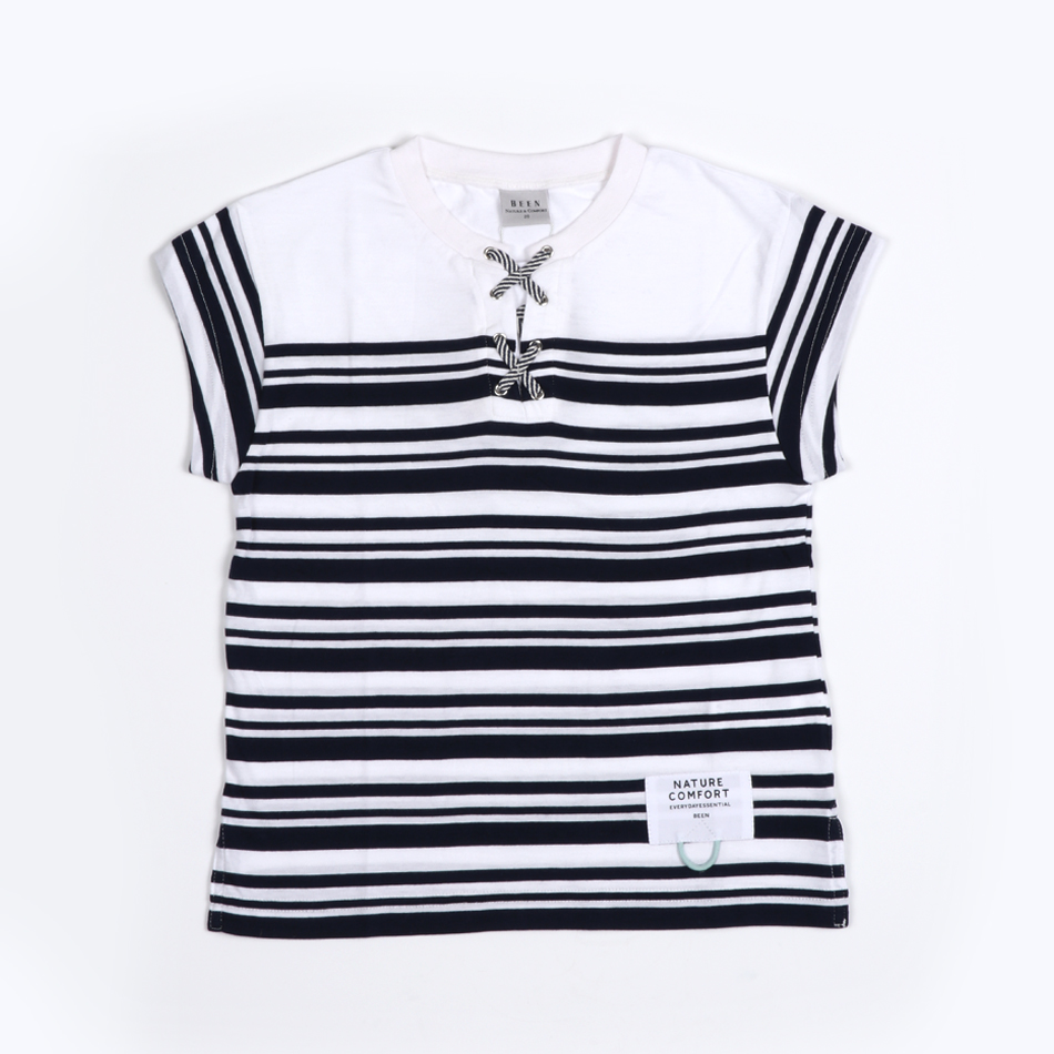 ■ 상세설명 화이트 컬러와 네이비 컬러가 불규칙하게 제안된 반팔 티셔츠입니다. 티셔츠 앞목에 아일렛과 스트링을 에스닉한 앞여밈 처리로 사용하여 리조트한 느낌을 주었습니다. PT06번과 세트로 제안할 수 있는 아이템입니다. | ||||||||