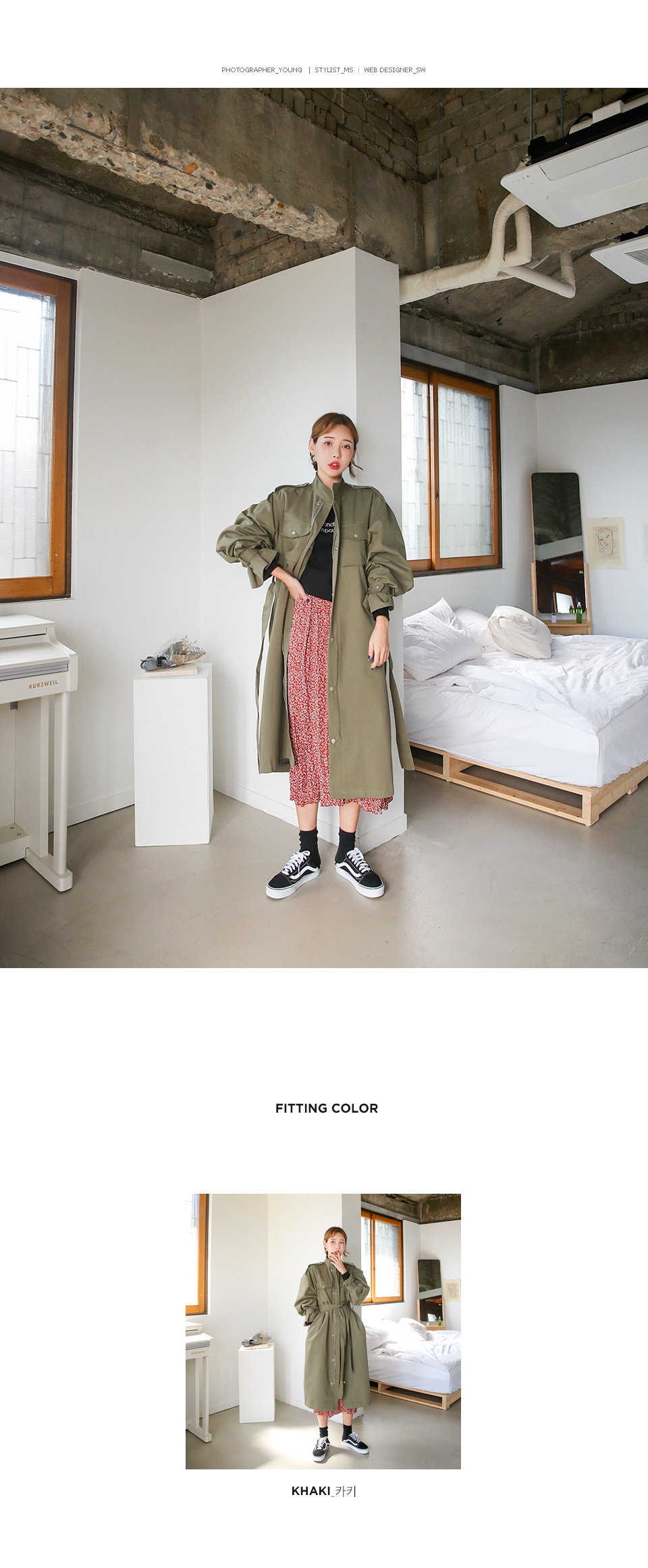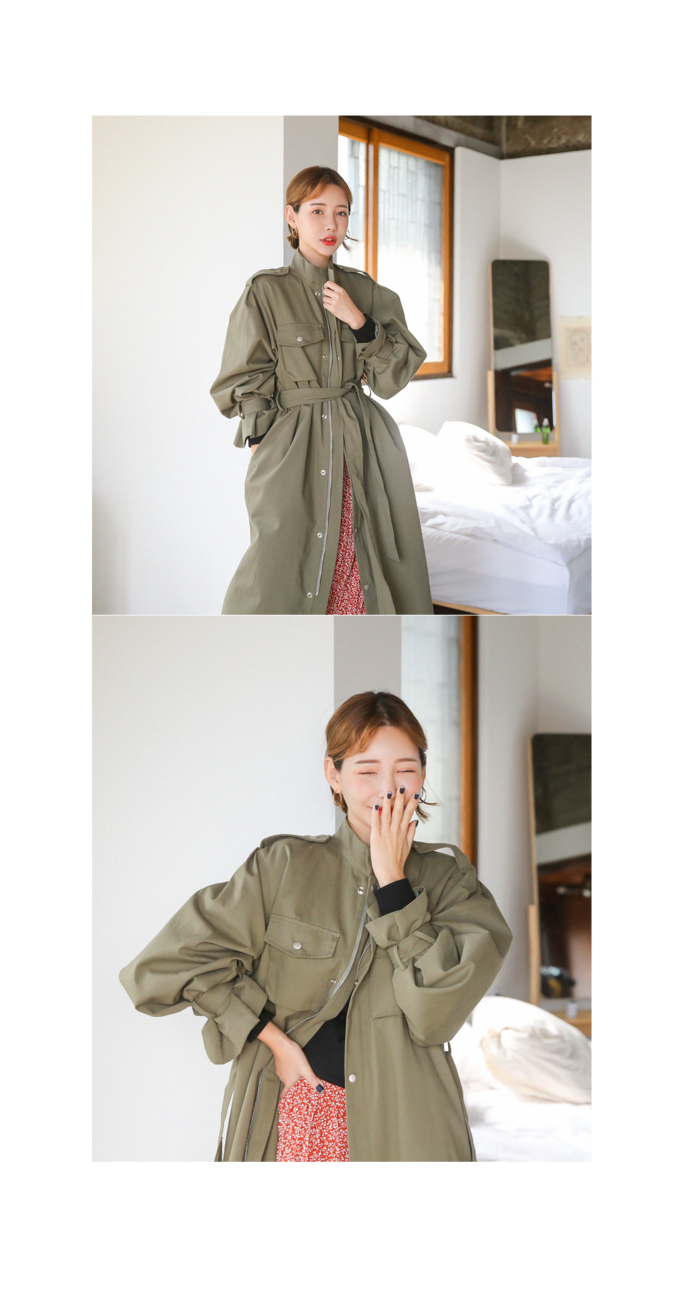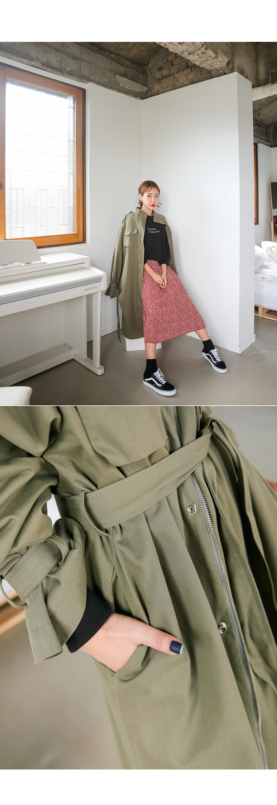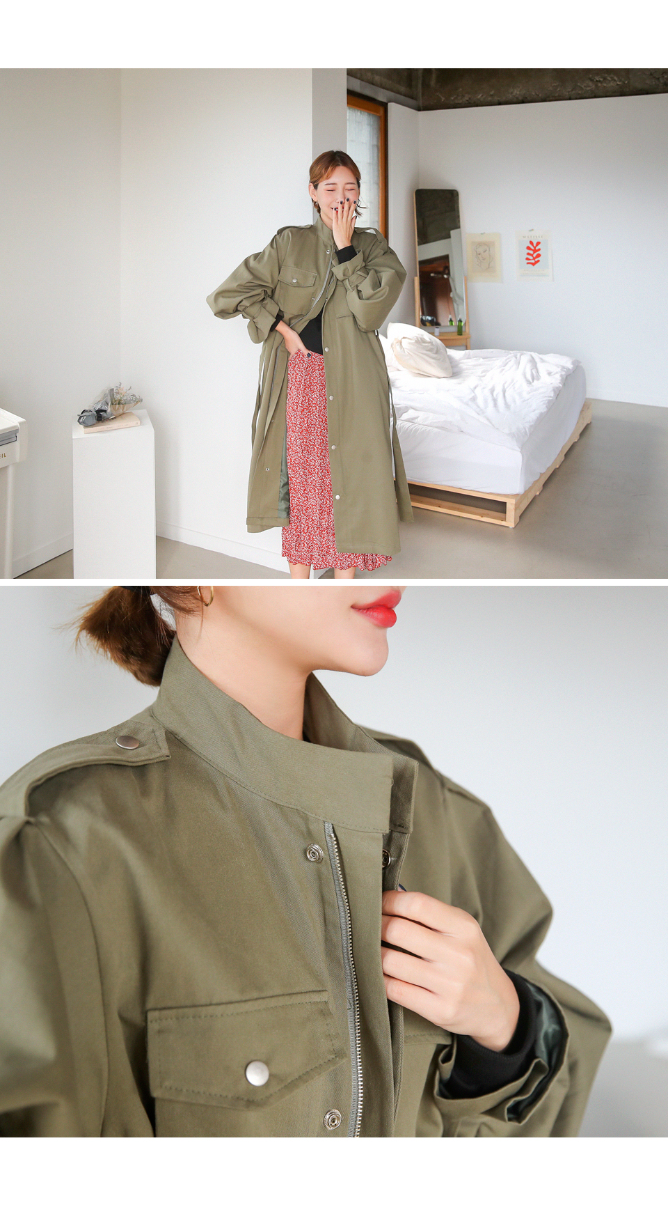 소매의 셔링과 앞면에 큰 포켓이 포인트가 되어 돋보이는 롱한 기장감의 야상