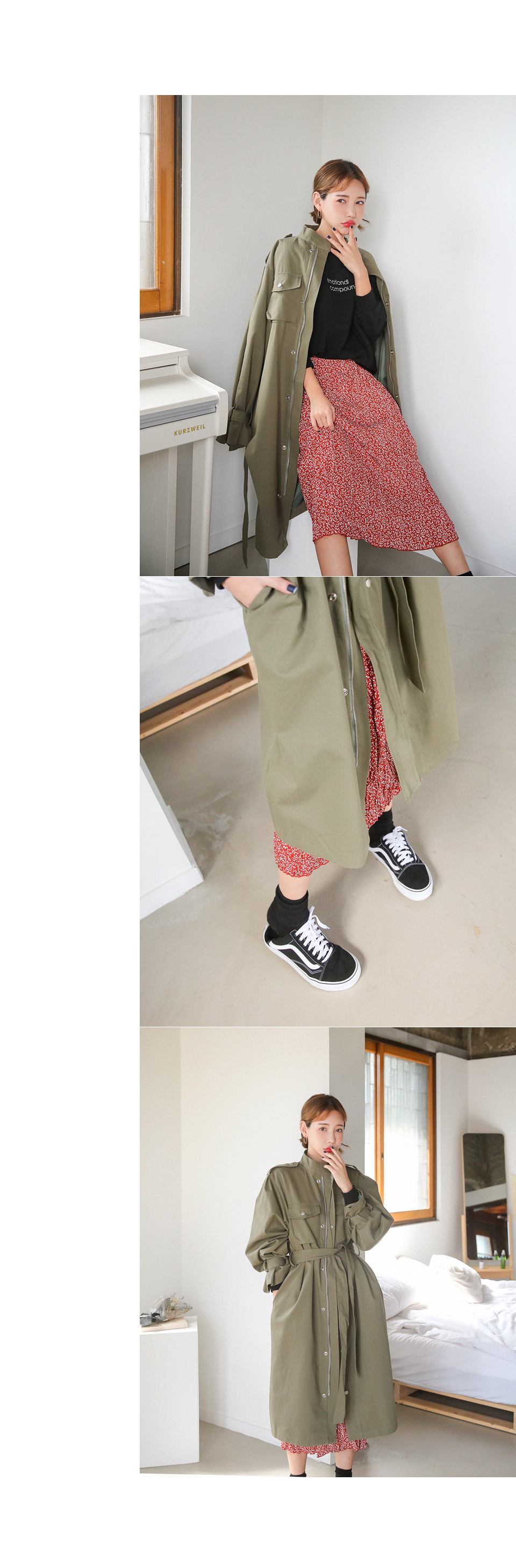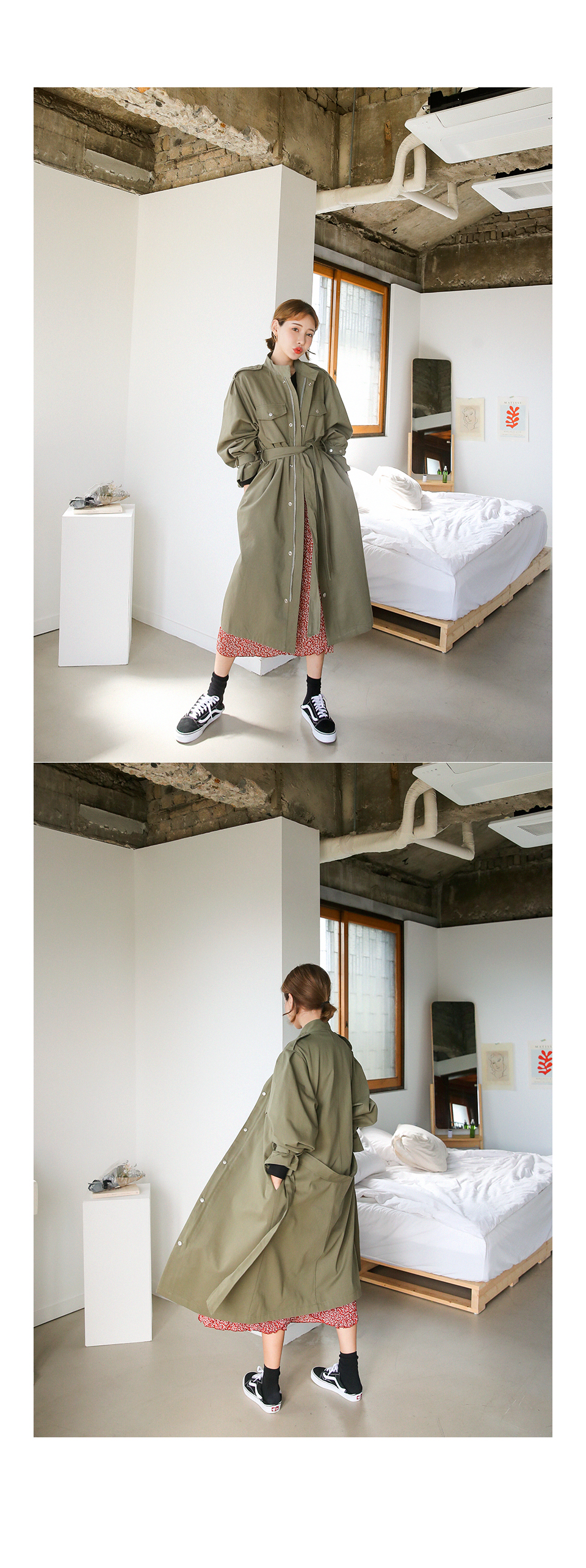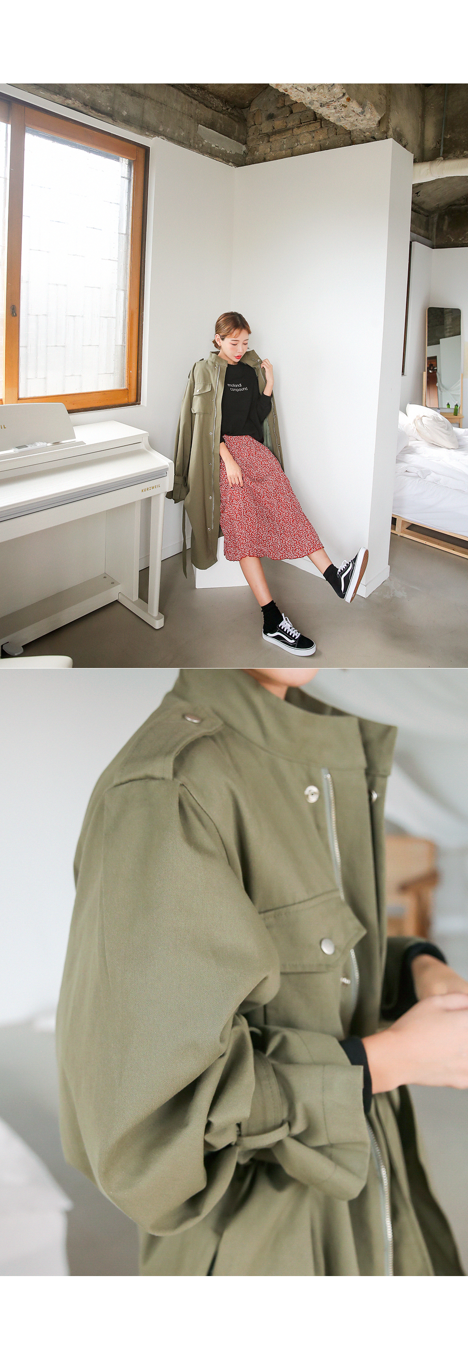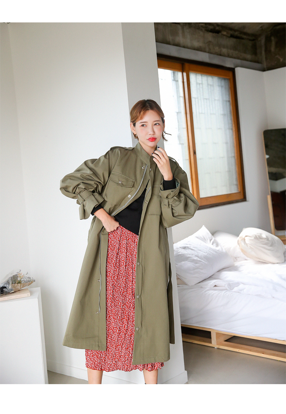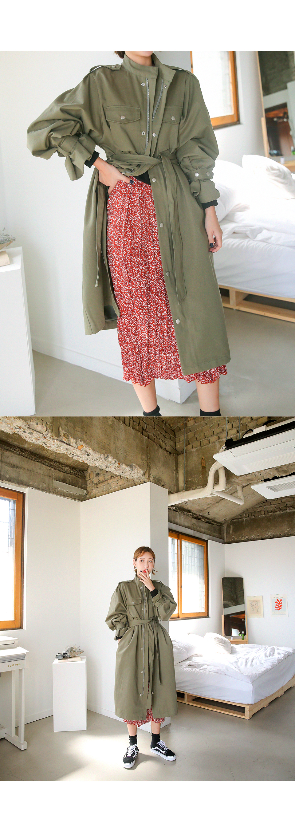 소매의 셔링과 앞면에 큰 포켓이 포인트가 되어 돋보이는 롱한 기장감의 야상