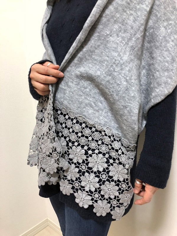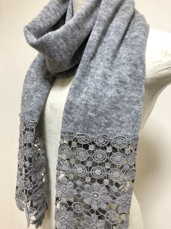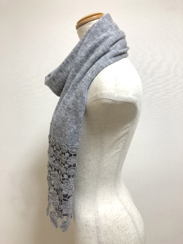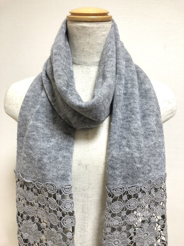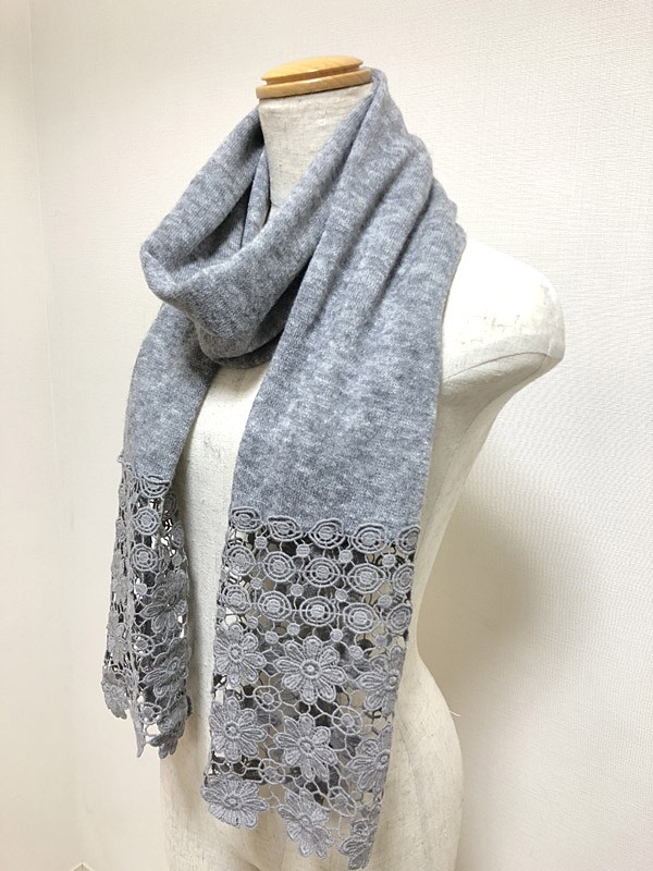 裾のレースが、ノーブルなオトナ可愛いを奏でる優しい風合いのニットマフラーです
