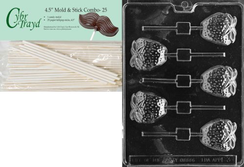 Cybrtrayd Strawberry Lolly Fruits and Vegetables Chocolate Candy Mold with 25 4.5-Inch Lollipop Sticks