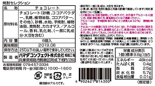 原材料:チョコレート(砂糖、ココアパウダー、乳糖、植物油脂、ココアバター、その他)、砂糖、水飴、芋焼酎、植物油脂、麦焼酎、カカオマス/アルコール、香料、乳化剤、(一部に乳成分・大豆を含む)