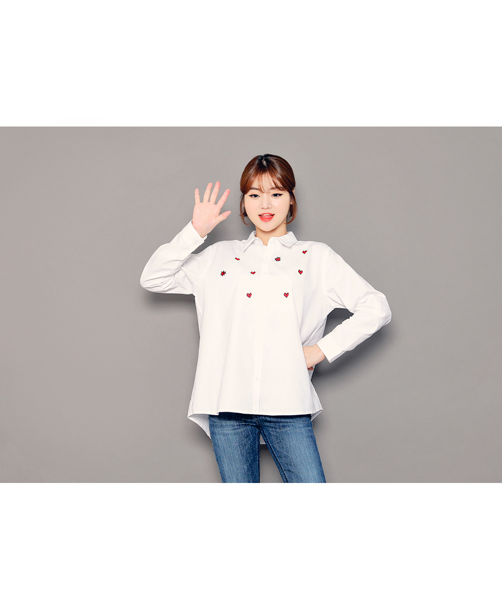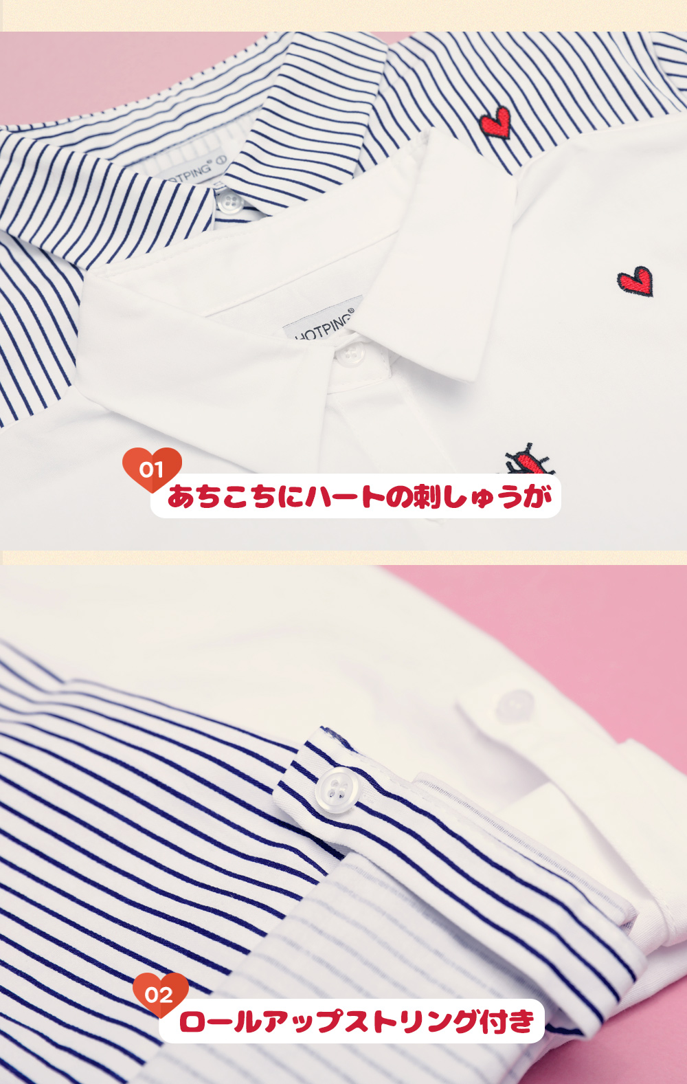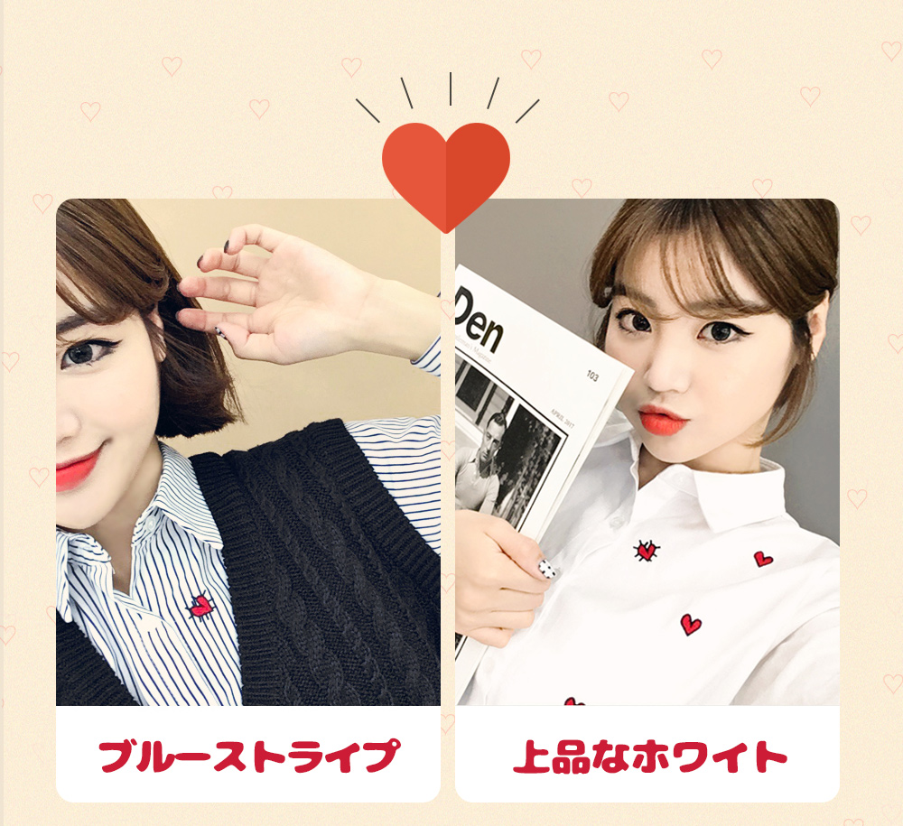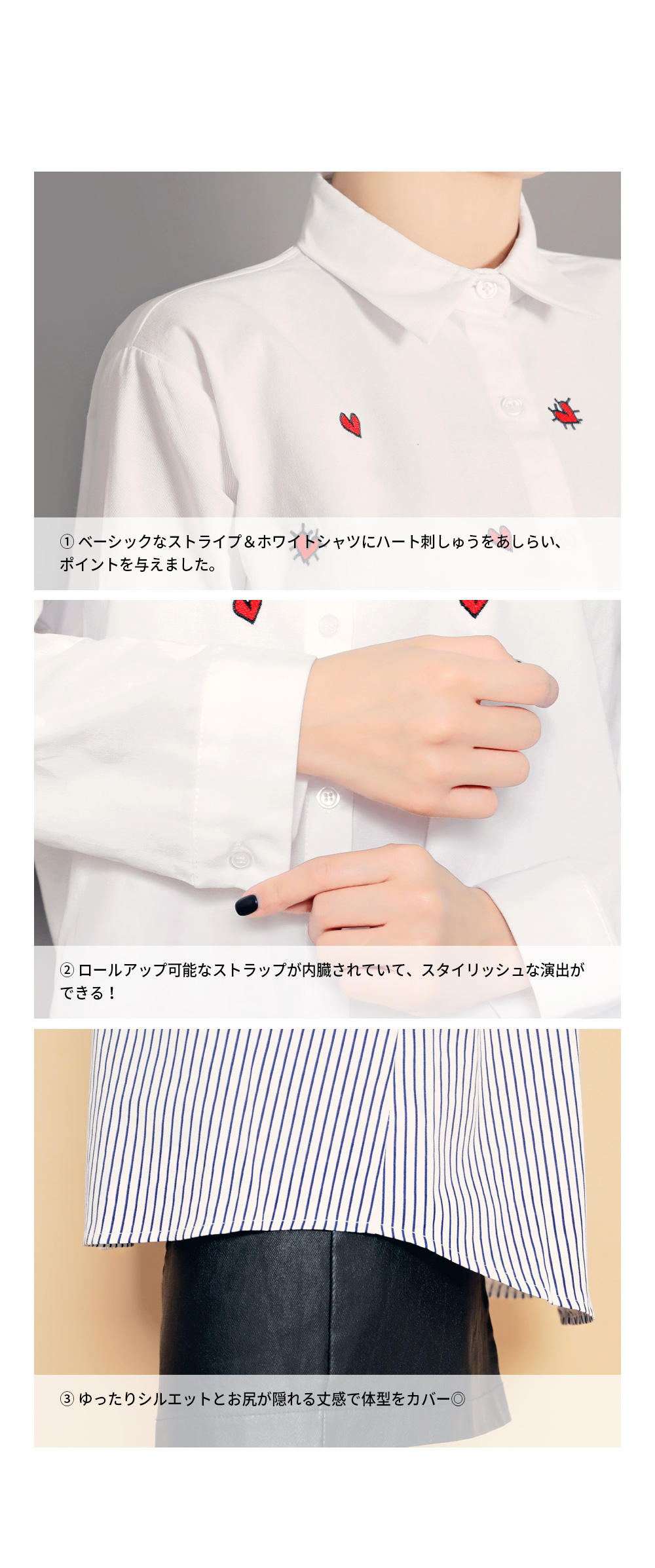 ベーシックなフィット感で、デイリー使いしやすいブラウスです。フロントのハート刺繍がラブリーなポイントに♡裾はロールアップして着られるので、様々な雰囲気を楽します♬シンプルながらもコーデのポイントになります。ホワイトとブルーストライプの2色展開です。